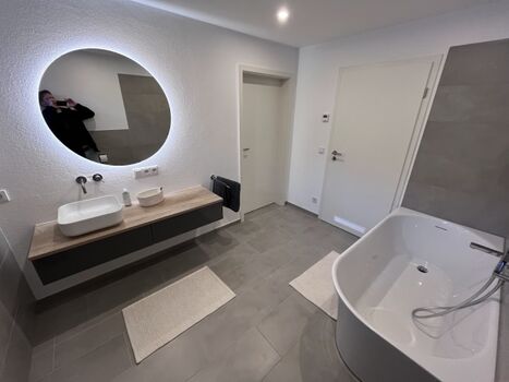 Waschbecken, Regendusche, Spiegel, Fenster im Bad