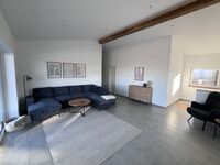 Großes Wohnzimmer mit Ausziehcouch für 2 weitere Gäste und 75" Smart TV und Balkon