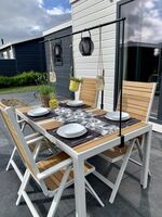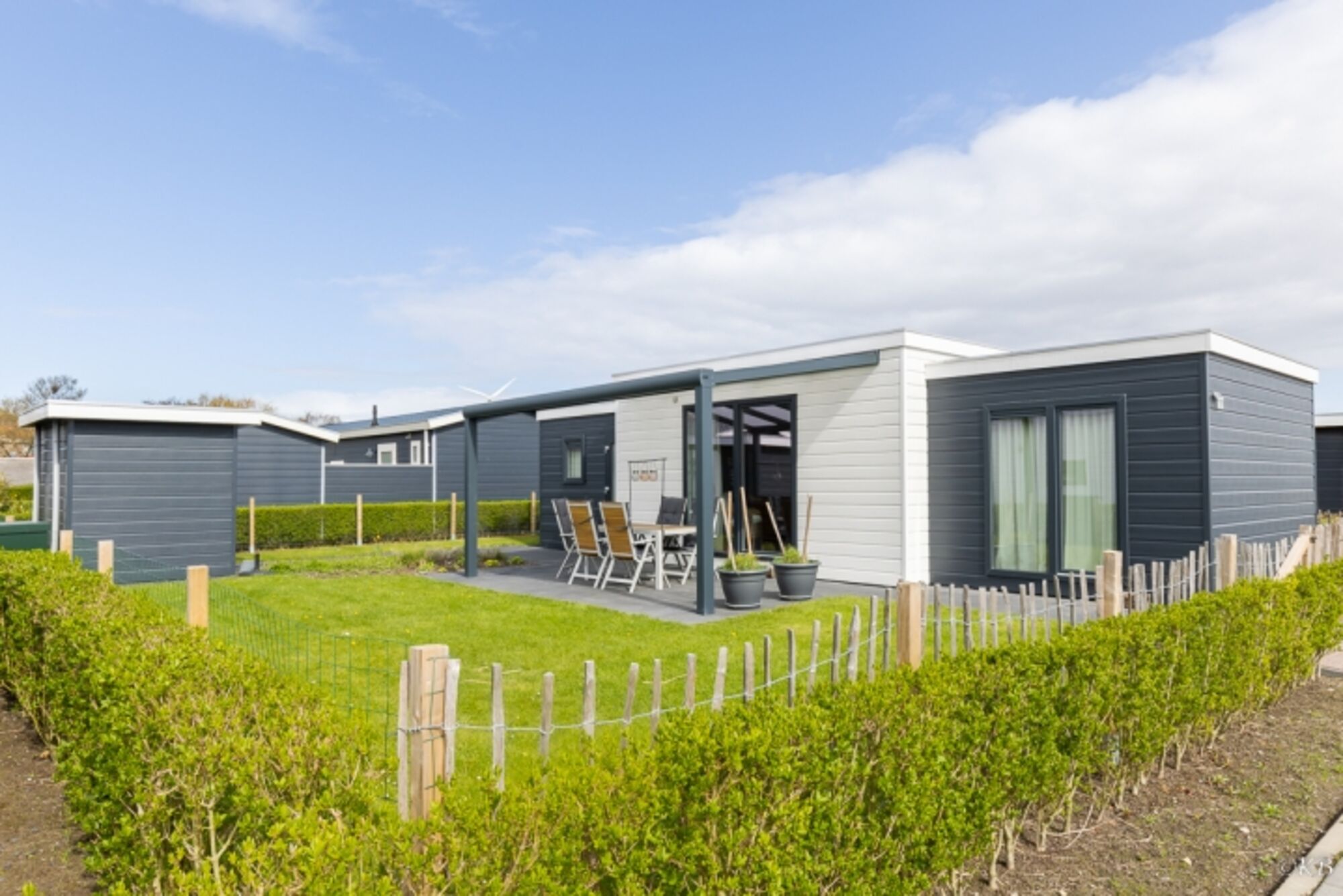 Der Garten ist mit wunderschönen Pflanzen angelegt und es gibt eine schöne überdachte Terrasse auf der Sie draußen sitzen können. Der Garten ist komplett von einem Zaun umgeben, so dass das Ferienhaus für Urlaub mit Hund optimal geeignet ist. Es gibt Parkplätze am Chalet, die kostenfrei nutzbar sind.