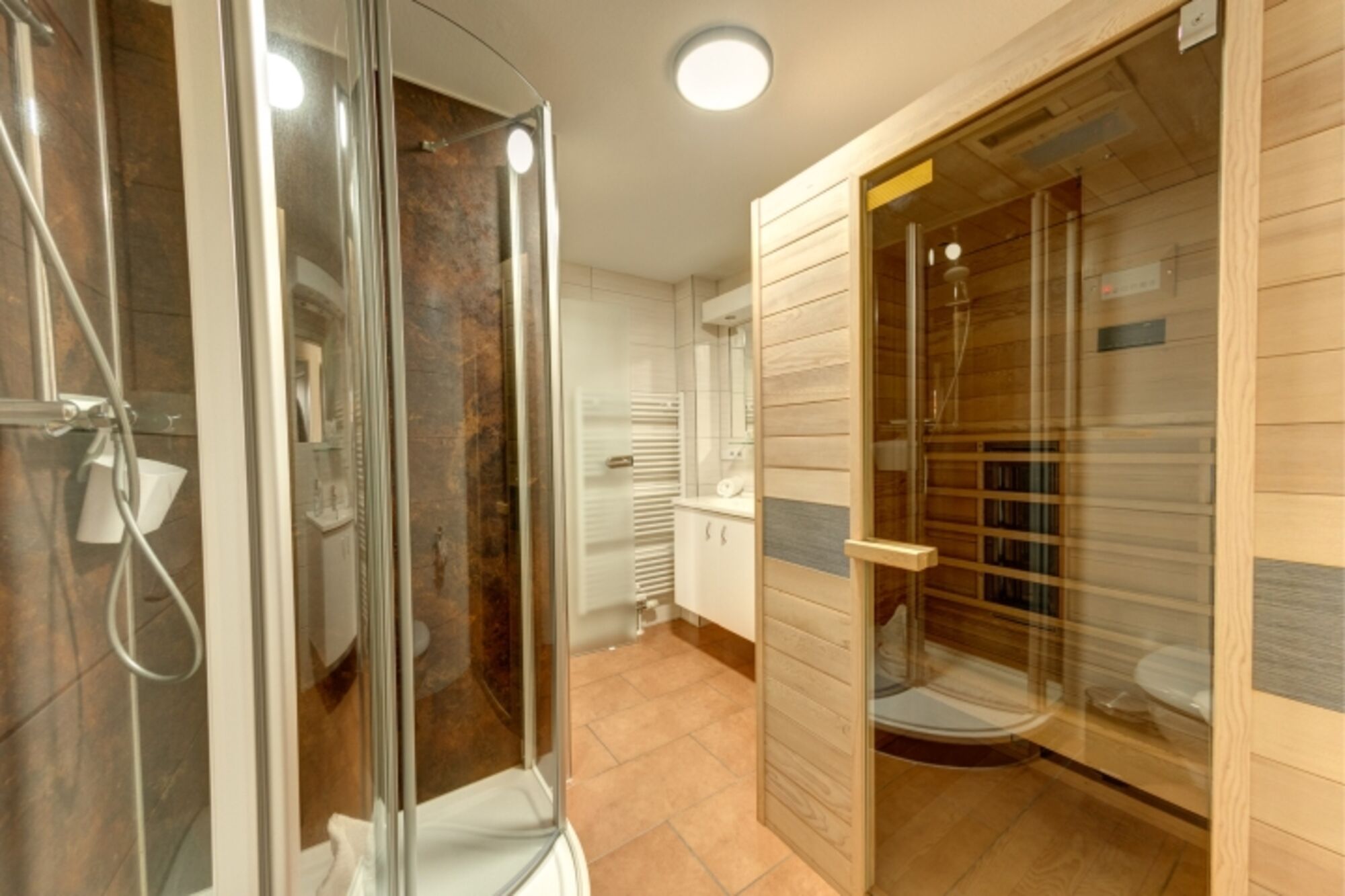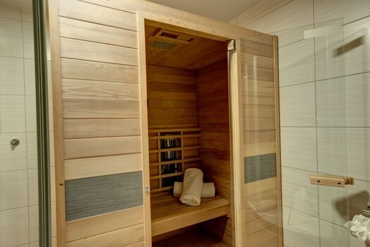 Zwei Schlafzimmer (eins davon mit zusätzlichem Fernseher), eine voll ausgestattete Küche und eine Infrarotkabine laden zum Wohlfühlen ein.