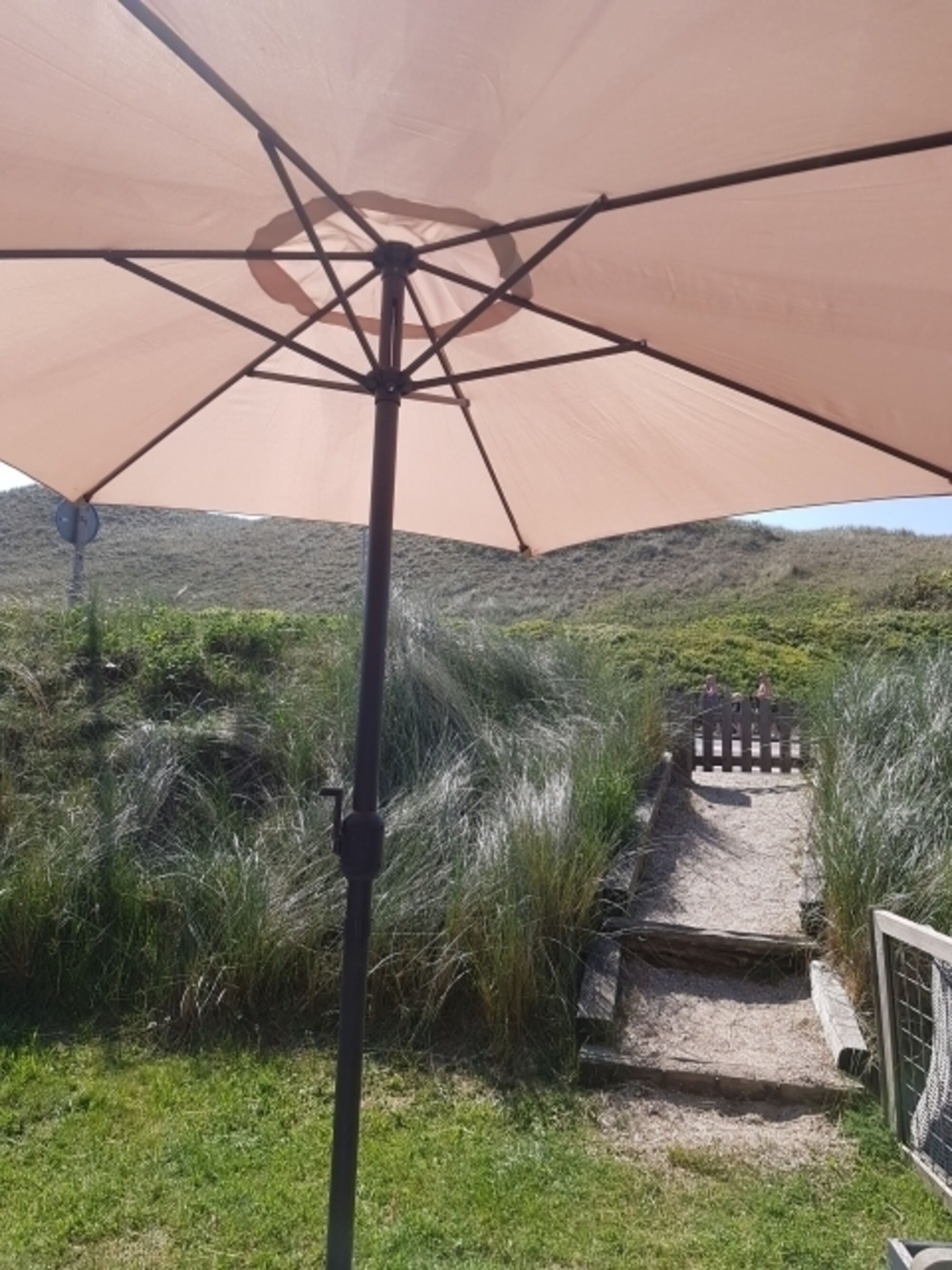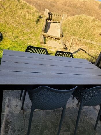eine private Terrasse mit Gartenmöbeln und Dünenblick (nicht eingezäunt)
