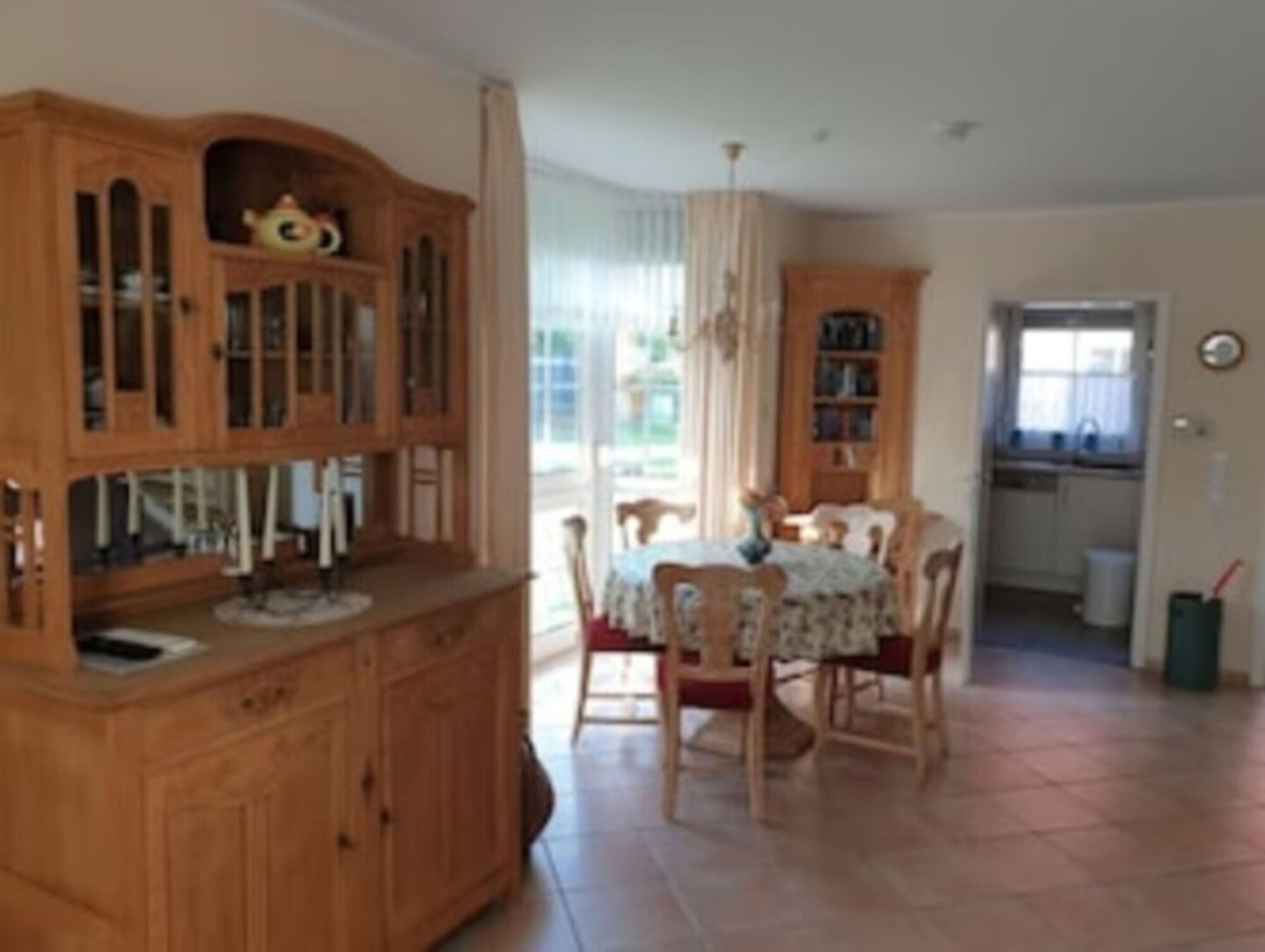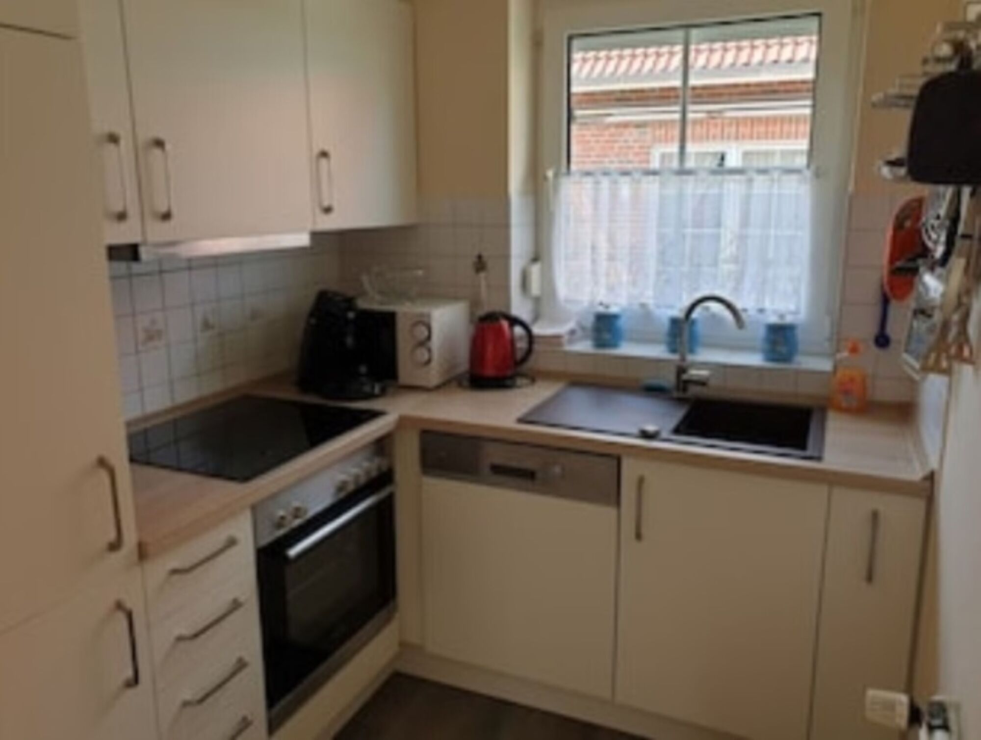 Cerankochfeld, Dunstabzugshaube, Kühlschrank mit Gefrierfach, Senseo-Kaffeeautomat, Eierkocher, Mixer, Korkenzieher / Flaschenöffner, Geschirrhandtücher