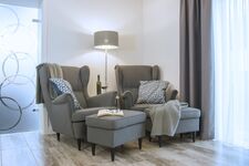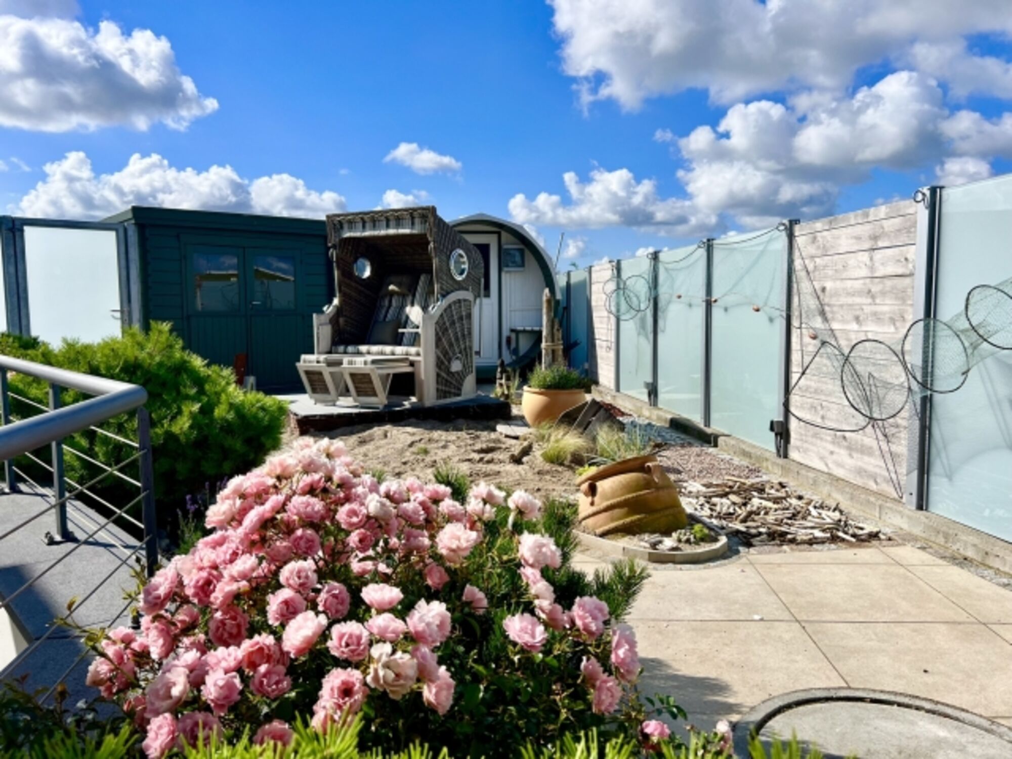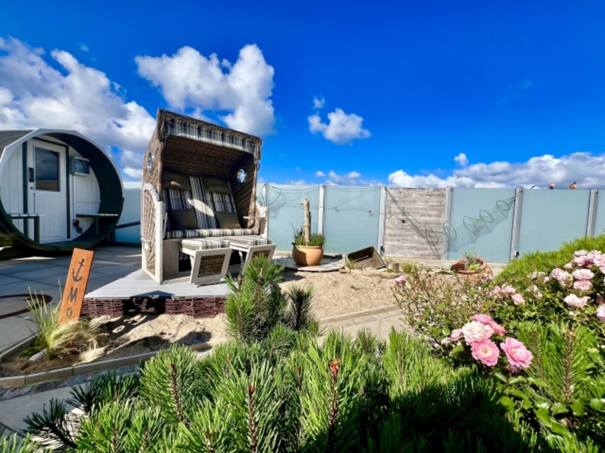 Genießen Sie Ihre Zeit im gemeinsamen Garten, wo Sie im Strandkorb die Sonne tanken oder in der Sauna neue Energie schöpfen können. Diese Außenbereiche teilen Sie sich harmonisch mit den Gästen der zweiten Wohnung im Haus.
