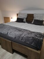 Das Schlafzimmer hat knapp 27 qm² und beinhaltet ein gemütliches Doppelbett was auf Wunsch auch in 2 Einzelbetten umfunktioniert werden kann, sowie noch ein weiteres massives Einzelbett. Doppelbett 1,80 x 2,00m, Einzelbett, Spiegel, Leselampe am Bett, Fliegengitter