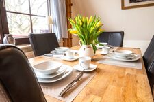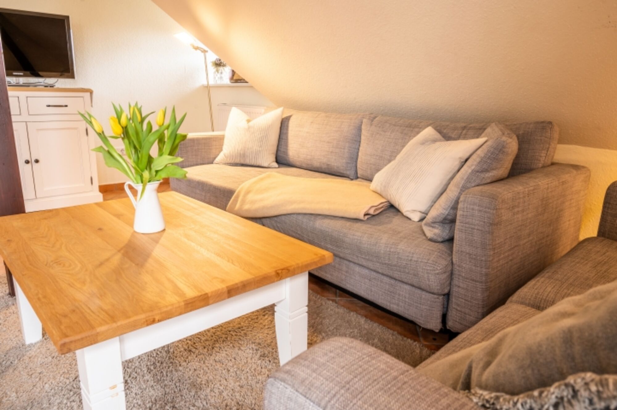 Die Einrichtung im modernen Landhausstil schafft eine behagliche Atmosphäre. Im Wohnbereich mit integrierter, voll ausgestatteter Küche können Sie es sich ebenso gemütlich machen wie im separaten Schlafzimmer mit Doppelbett. Eine zusätzliche Schlafcouch befindet sich im Schlafzimmer. Für Ihr Auto steht ein kostenloser Stellplatz zur Verfügung, Ihre Fahrräder finden Platz im geschützten Carport.