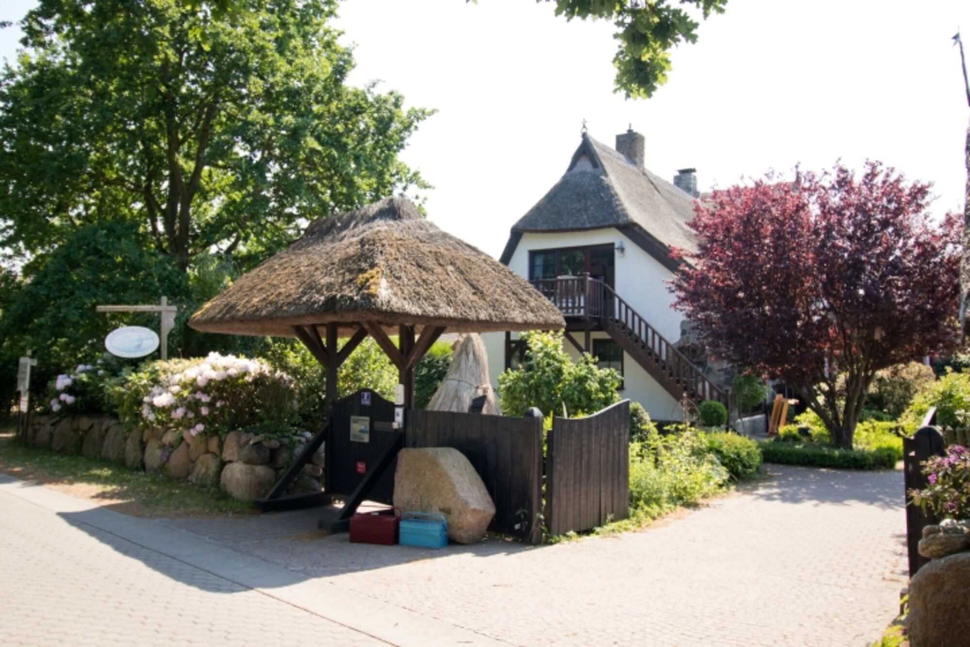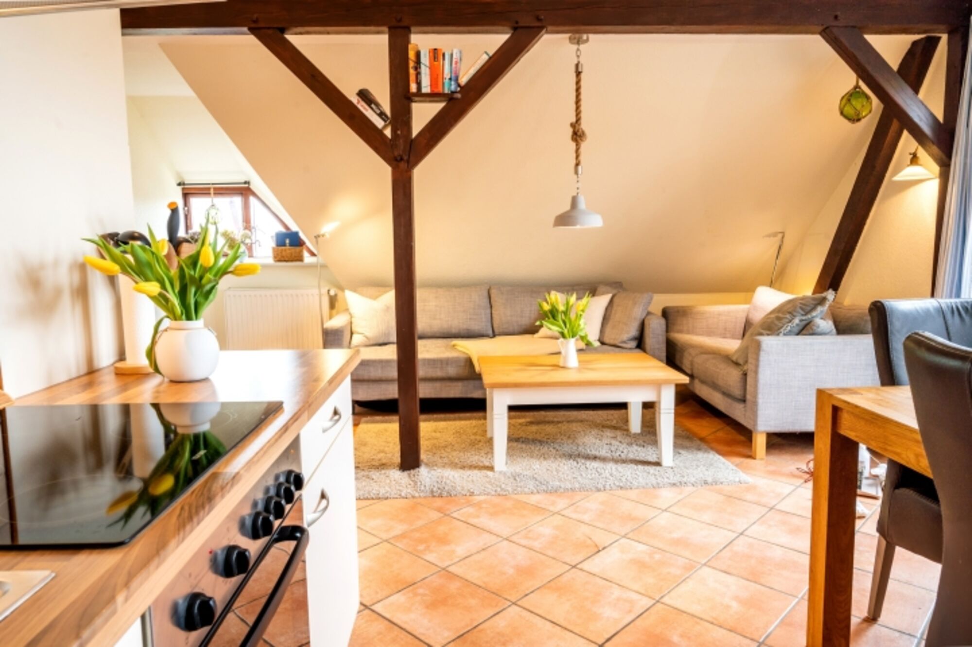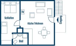 Die gemütliche Dachgeschosswohnung liegt im ersten Stock direkt unter dem Reetdach und ist über eine separate Außentreppe zu erreichen. Die Ferienwohnung bietet auf ca. 50 qm ausreichend Platz für zwei Personen (eine zusätzliche Aufbettung ist möglich) und verfügt über einen eigenen Balkon sowie eine Sitzgelegenheit im Garten.