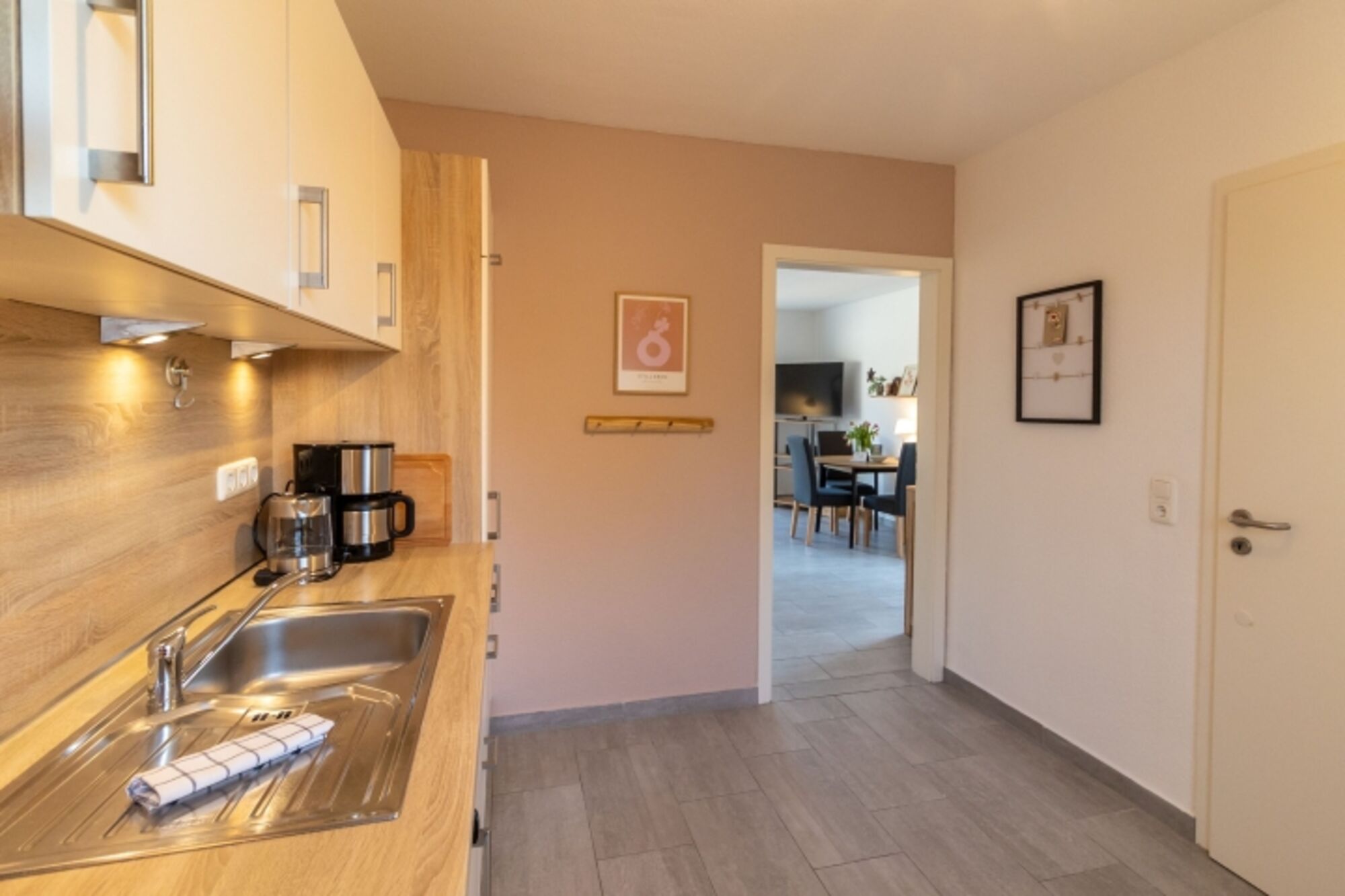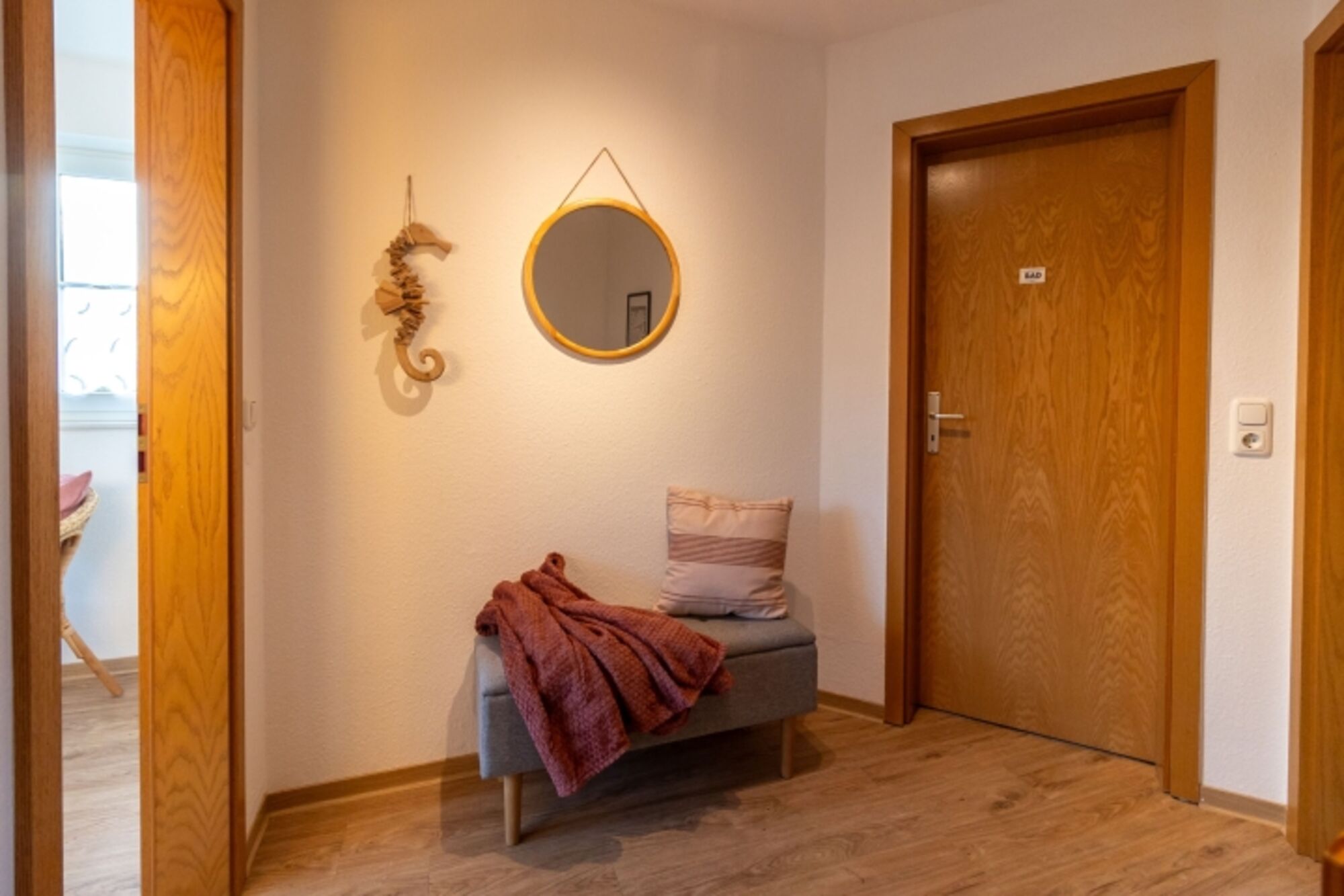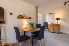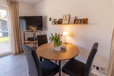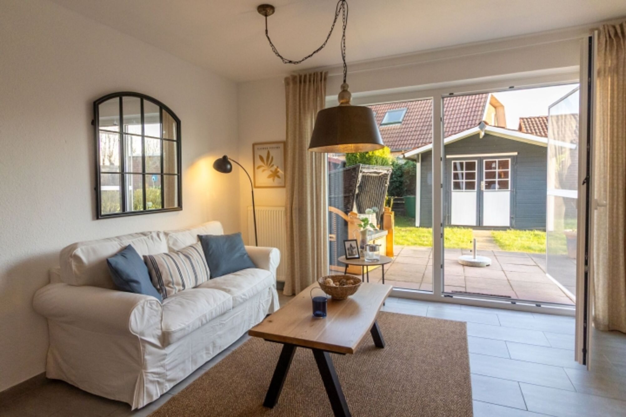• Einen kleinen Flur mit versteckter Waschmaschine, • Eine separate, voll ausgestattete Küche (Geschirrspüler, Mikrowelle, Kaffeemaschine, Wasserkocher, Toaster, Handrührgerät und mehr) • Ein einladendes Wohn-/Esszimmer mit Essecke, gemütlichem Sofa, Fernseher und Radio/CD-Player. Große Fenster mit Terrassentür (inkl. Fliegengitter) öffnen den Blick in den Garten. • Im Außenbereich laden eine möblierte Terrasse, ein Strandkorb und ein gepflegter Garten zum Verweilen ein. Eine geräumige Gartenhütte bietet Platz für Fahrräder oder weiteres Equipment.