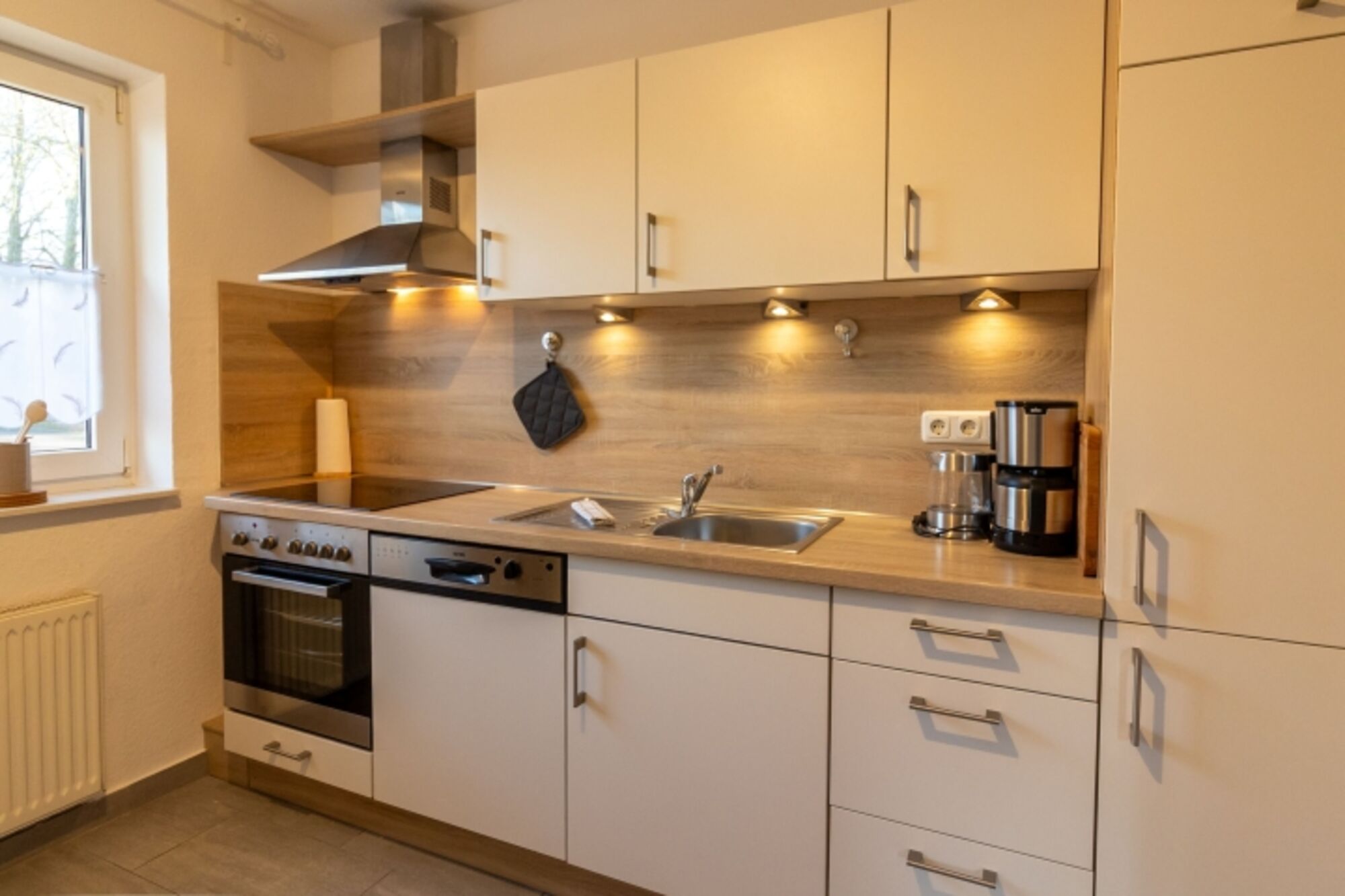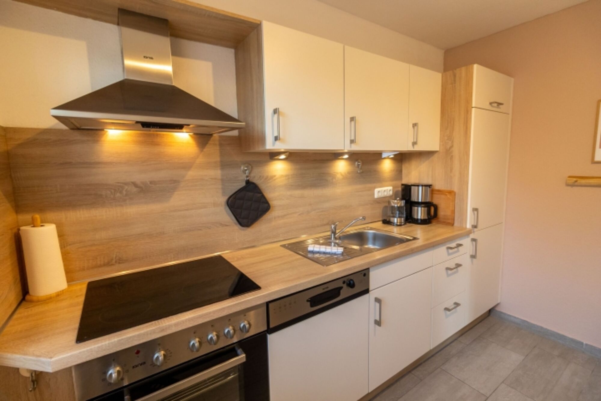 Cerankochfeld, Dunstabzugshaube, Kühlschrank mit Gefrierfach, Korkenzieher / Flaschenöffner, Gewürze (Salz, Pfeffer, Zucker), Geschirrhandtücher, Mülltüten