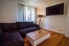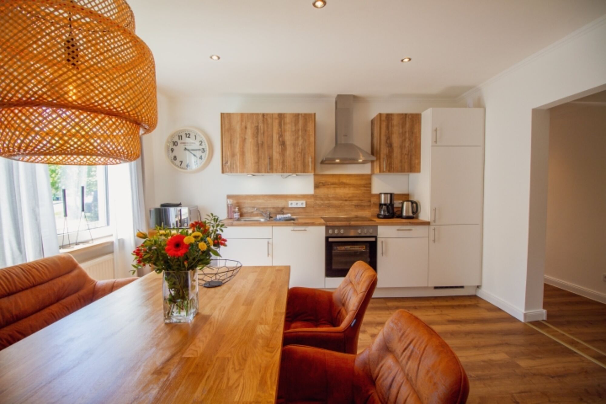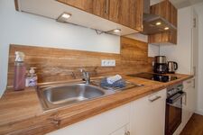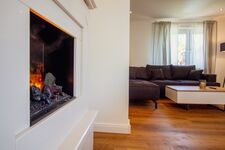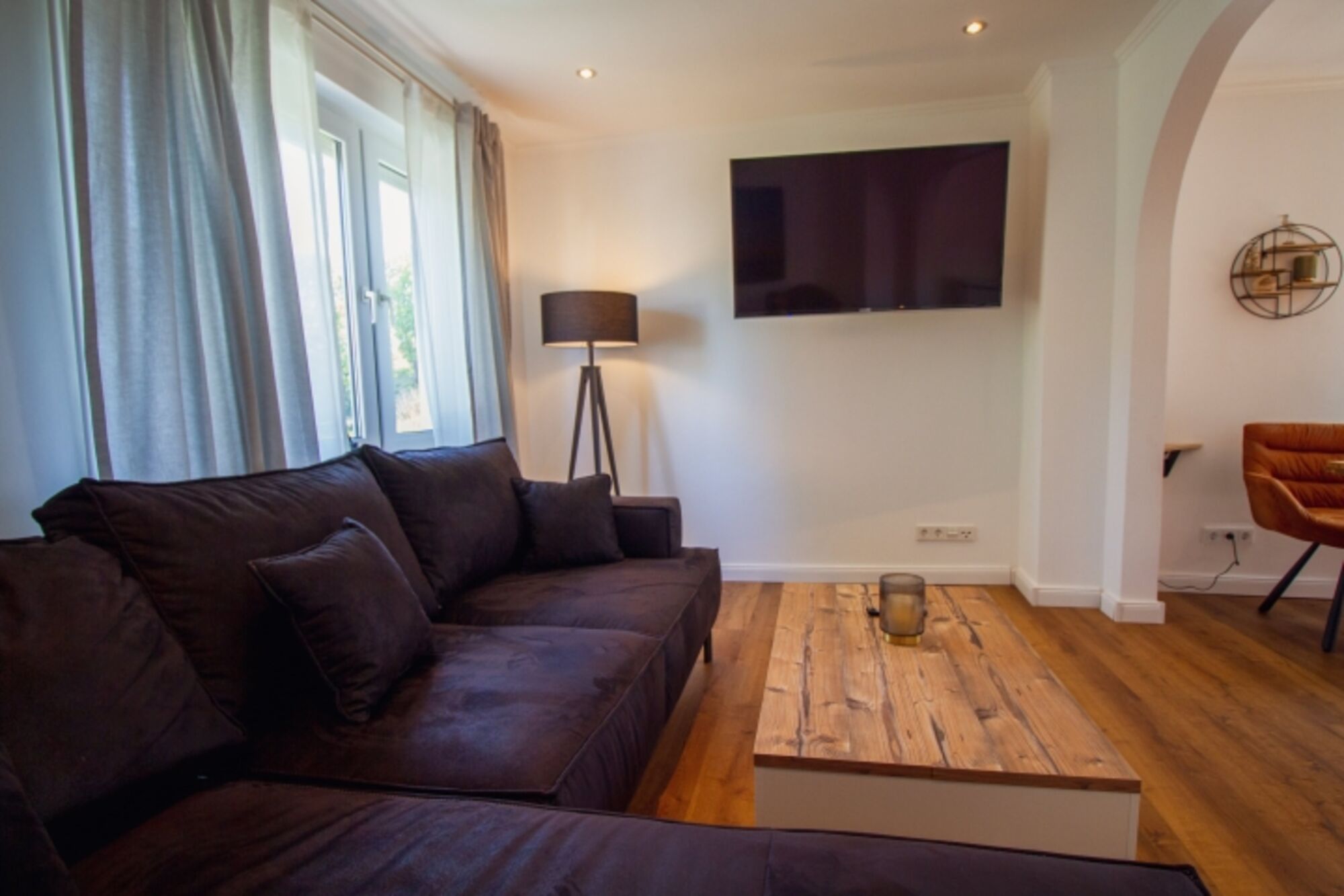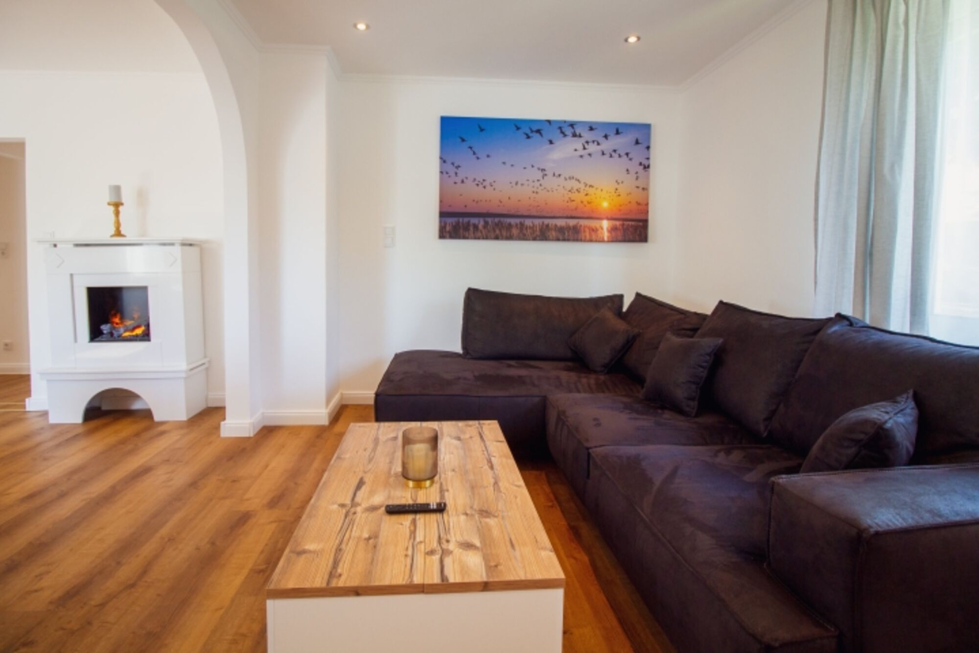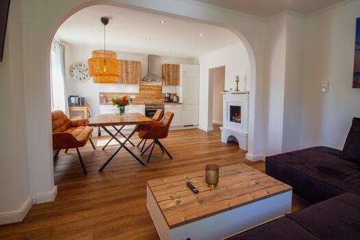 Die Ferienwohnung Sonne hat einen schönen offenen Wohnraum mit vollausgestatteter Küche und einer gemütlichen Sofaecke mit großem Smart TV und Kamin.