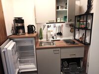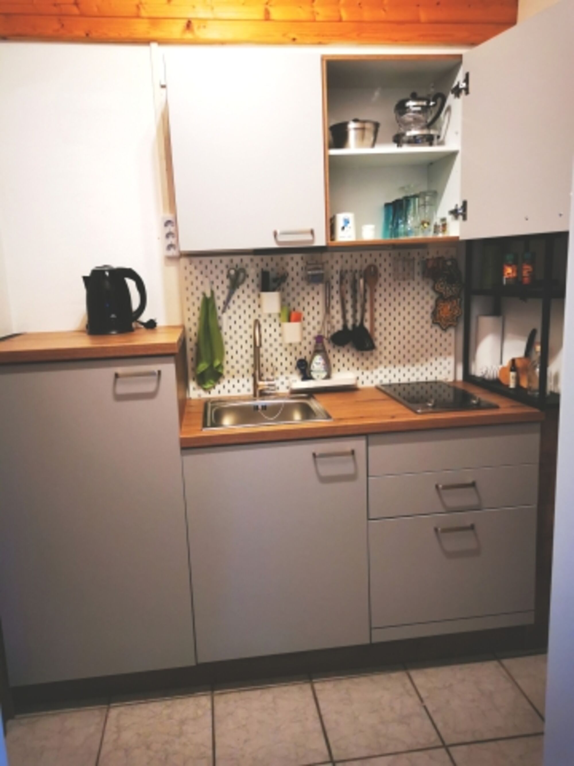 2-Platten Herd, Cerankochfeld, Kühlschrank mit Gefrierfach, Eierkocher, Korkenzieher / Flaschenöffner, Gewürze (Salz, Pfeffer, Zucker), Geschirrhandtücher