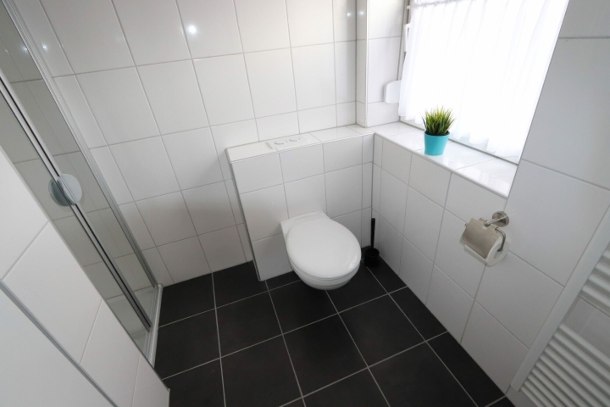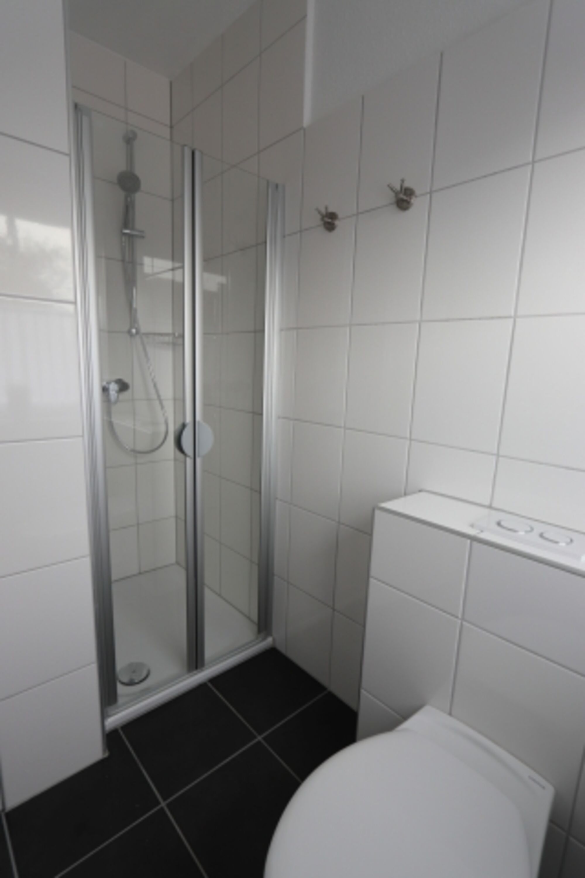 Das Badezimmer mit Tageslicht ist hell und freundlich gefliest und verfügt über eine Dusche (Duschkabine), WC, Waschtisch und Spiegel.