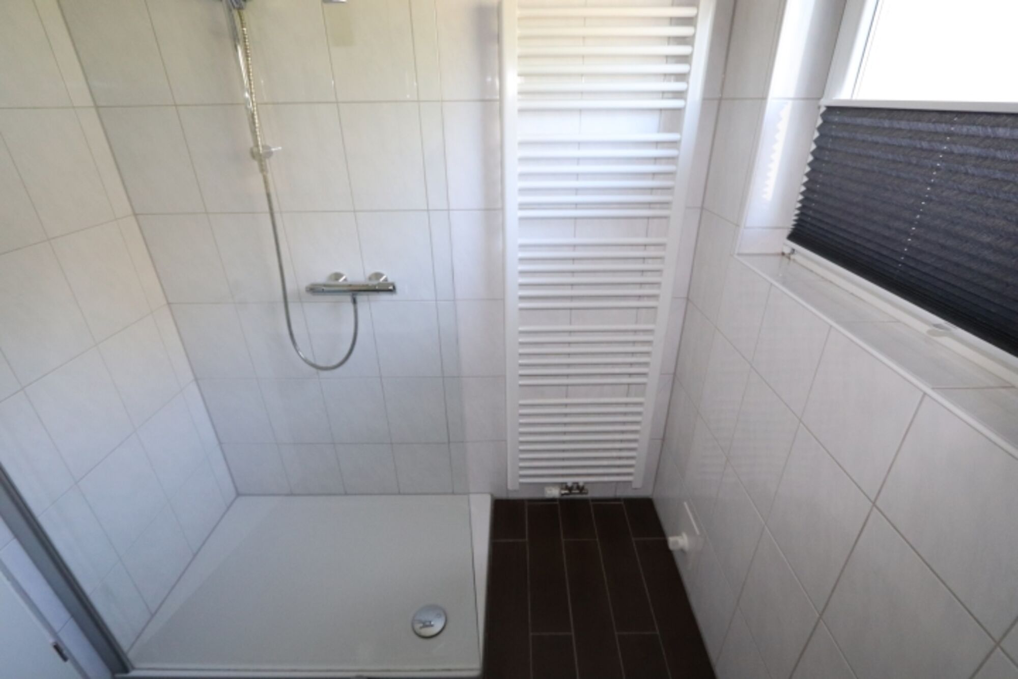 Das Badezimmer mit Tageslicht ist hell und freundlich gefliest und verfügt über eine Dusche (Duschkabine), WC, Waschtisch und Spiegel.