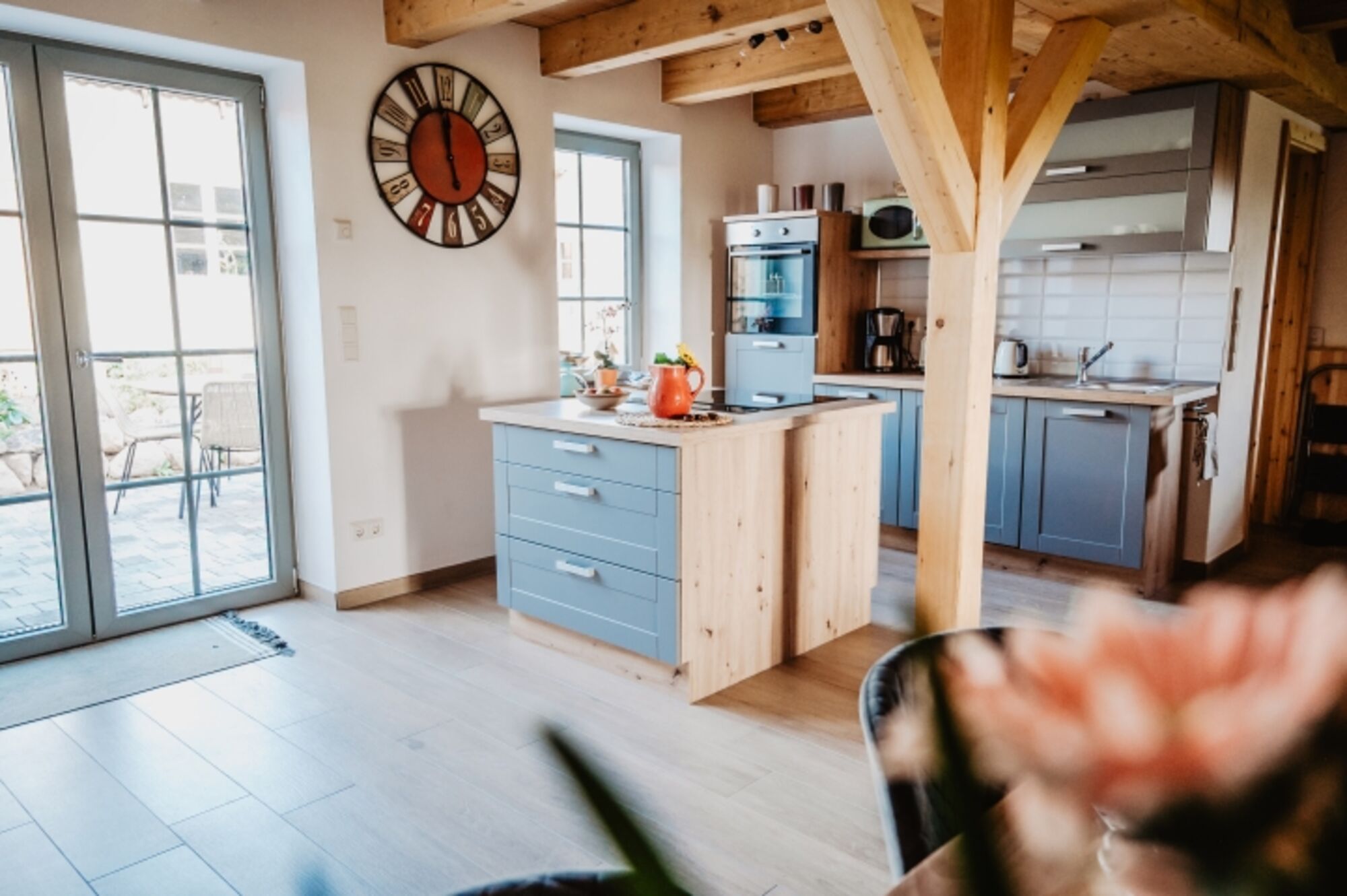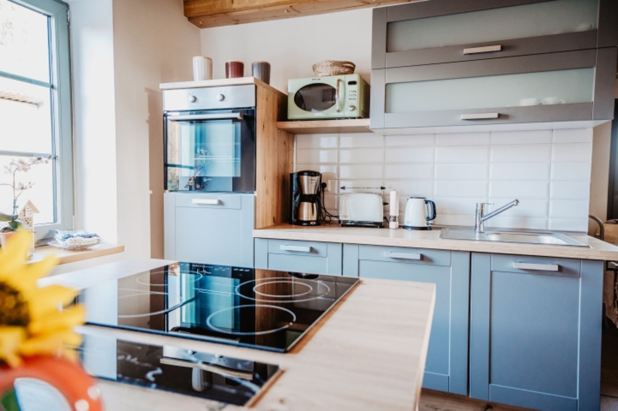 4-Platten Herd, Cerankochfeld, Dunstabzugshaube, Kühlschrank mit Gefrierfach, Tassimo-Kaffeautomat, Eierkocher, Mixer, Waffeleisen, Korkenzieher / Flaschenöffner, Gewürze (Salz, Pfeffer, Zucker), Öl / Essig, Geschirrhandtücher, Mülltüten