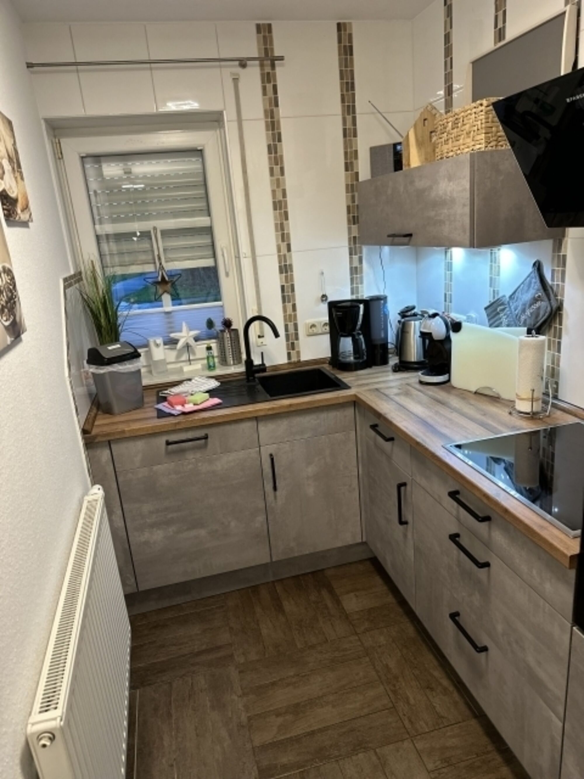 4-Platten Herd, Induktionsherd, Dunstabzugshaube, Kühlschrank mit Gefrierfach, Gefrierschrank, Kaffeevollautomat, Eierkocher, Mixer, Korkenzieher / Flaschenöffner, Gewürze (Salz, Pfeffer, Zucker), Öl / Essig, Geschirrhandtücher, Mülltüten