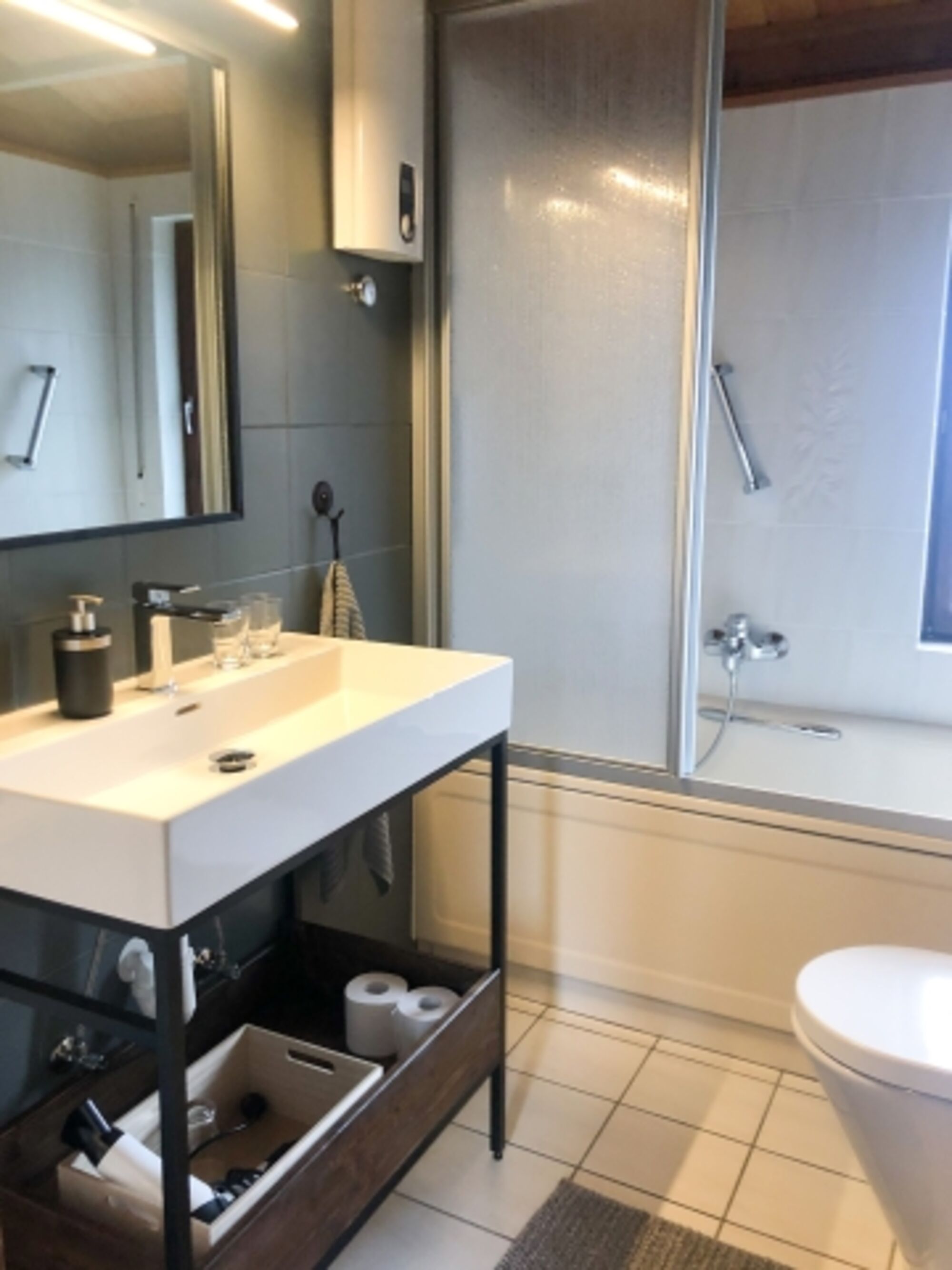Das Badezimmer ist mit einer gemütlichen Badewanne ausgestattet, die dank integrierter Duschmöglichkeit sowohl zum entspannten Baden als auch zum erfrischenden Duschen einlädt.