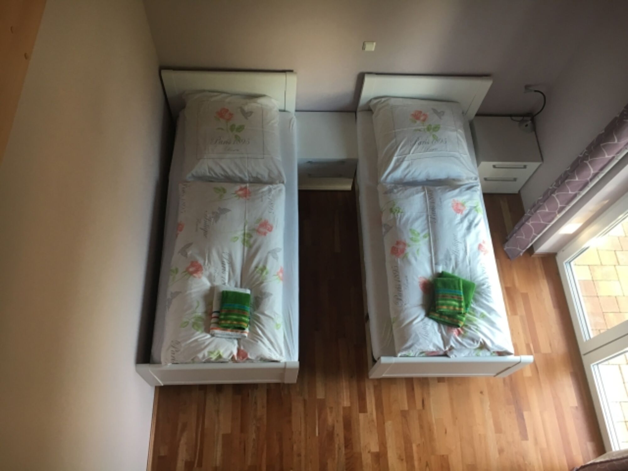 Das zweite Schlafzimmer hat alternativ ein Doppelbett oder 2 Einzelbetten. Auf der Galerie steht ein weiteres Einzelbett. Doppelbett 1,80 x 2,00m, Einzelbett, Wecker