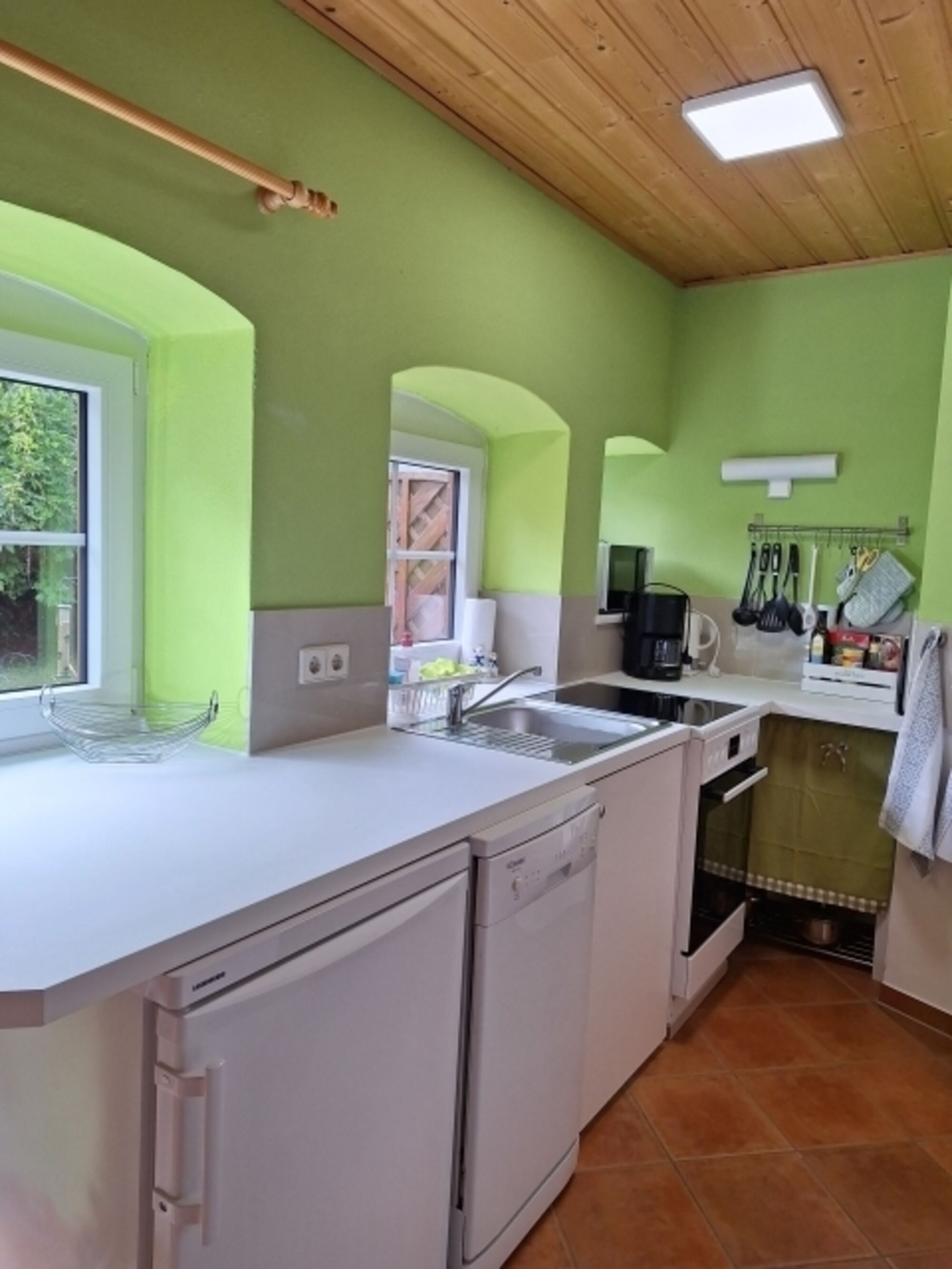 4-Platten Herd, Cerankochfeld, Induktionsherd, Gasofen / Gasherd, Kühlschrank mit Gefrierfach, Eierkocher, Mixer, Korkenzieher / Flaschenöffner, Gewürze (Salz, Pfeffer, Zucker), Öl / Essig, Geschirrhandtücher, Mülltüten, Essplatz in der Küche, TV in der Küche