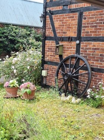 Unsere kleine Ferienwohnung ist gemütliche 50 qm groß und ist urgemütlich. Im Erdgeschoss befindet sich der offene Wohn-und Essbereich mit einer komplett ausgestatteten Kitchenette. Daran grenzt das Bad mit WC und Dusche . Im Obergeschoss liegt der offene Schlafboden mit zwei Einzelbetten und einem geräumigen Kleiderschrank. Die Terasse mit Markise, Gartenmöbeln ist ein guter Beobachtungspunkt für die Spatzenbande, die alljährlich zur Jungen-Aufzucht hier einfällt. Hinter der Scheune liegt die große Spiel- und Hundewiese, auf der sich Zwei- und Vierbeiner austoben können. Allerlei Spielsachen finden sich im Spieleraum in der Scheune.