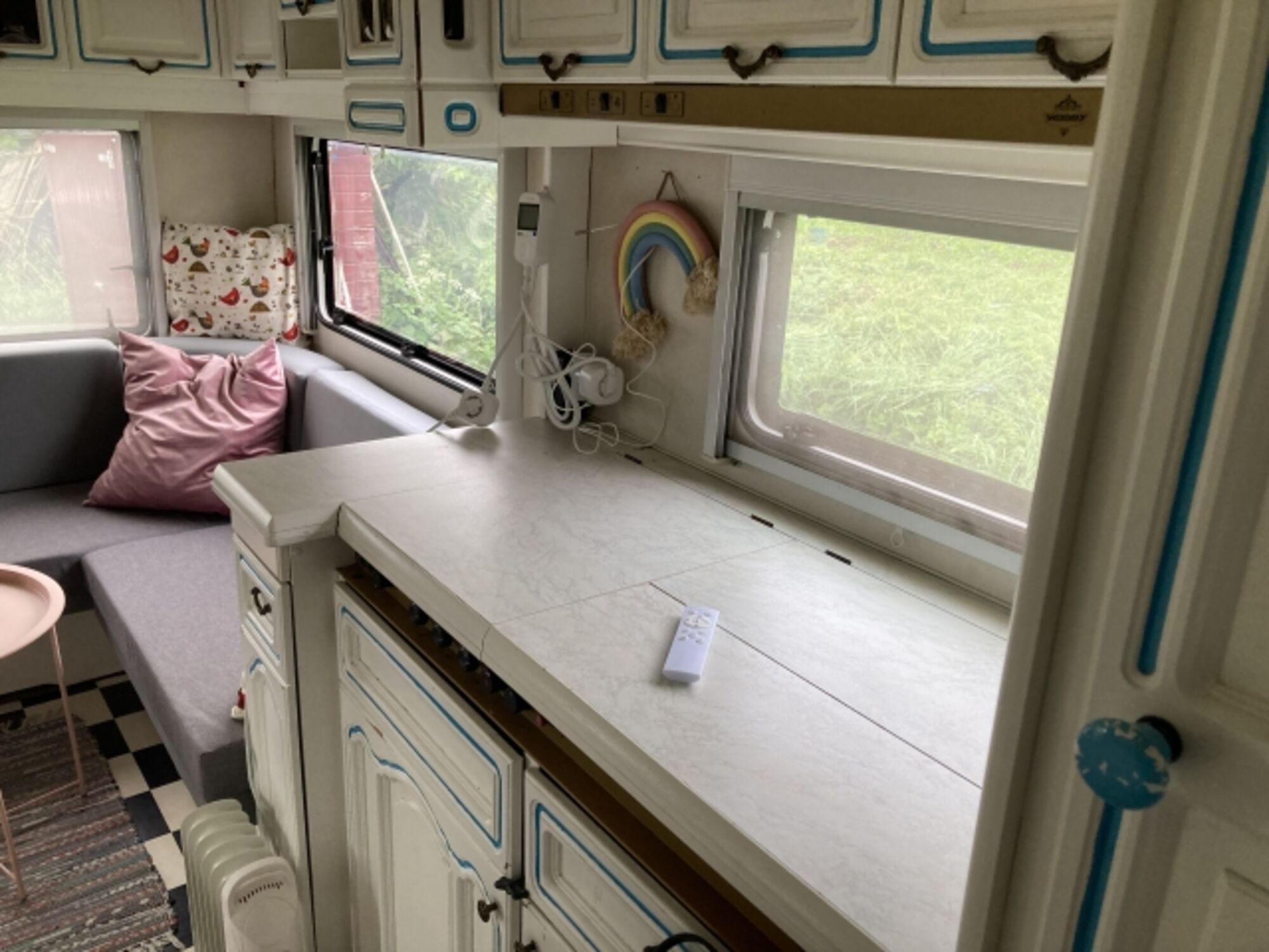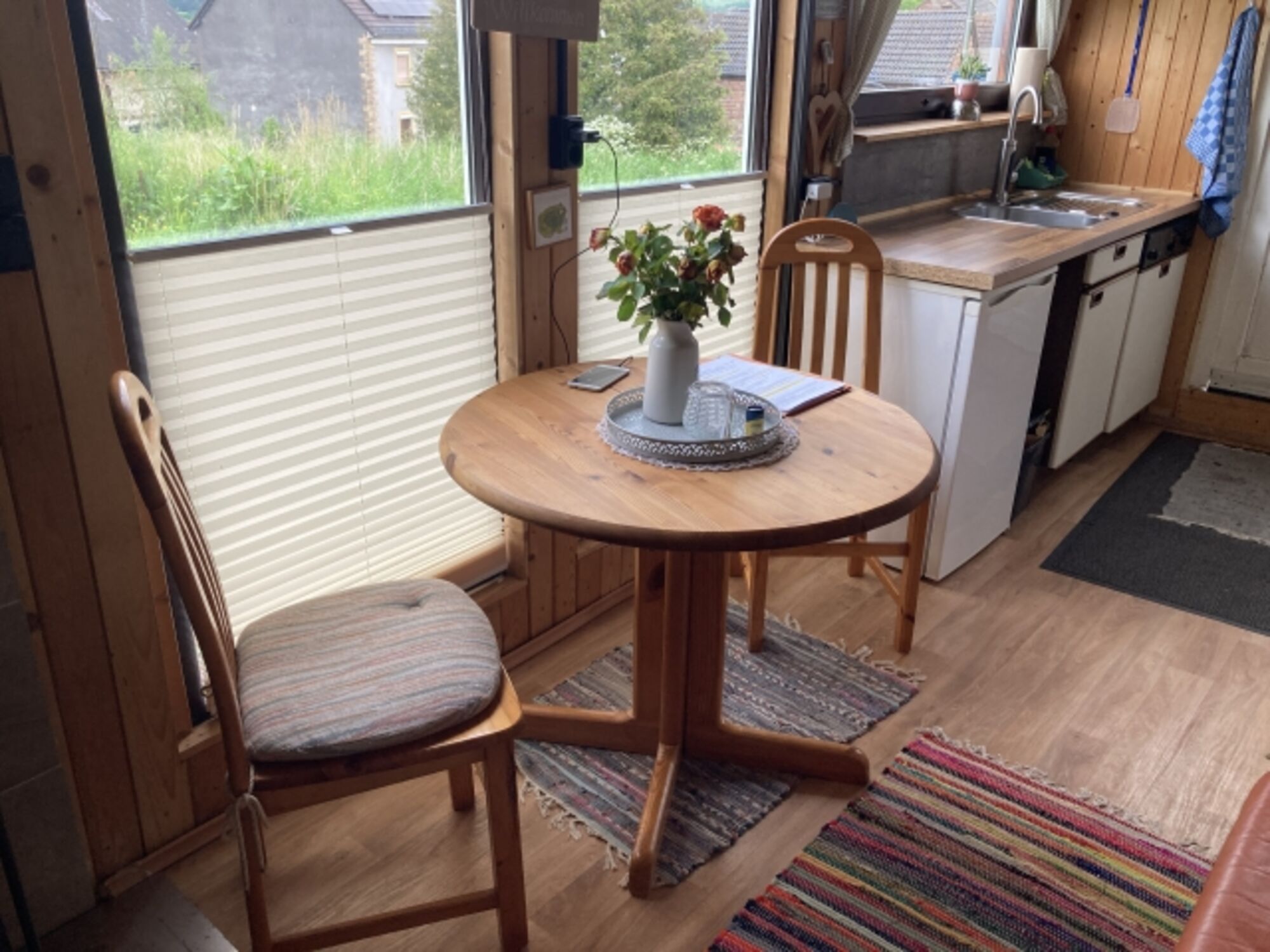 2-Platten Herd, Cerankochfeld, Kühlschrank mit Gefrierfach, Senseo-Kaffeeautomat, Mixer, Korkenzieher / Flaschenöffner, Gewürze (Salz, Pfeffer, Zucker), Öl / Essig, Geschirrhandtücher, Mülltüten, Essplatz in der Küche