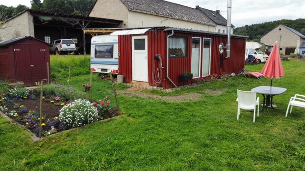 Das Chalet liegt idyllisch auf einer Wiese, wo Sie die Ruhe der Vulkaneifel genießen und dem friedlichen Gackern von Nachbars Hühnern lauschen können, die manchmal vorbeischauen – Landleben pur!
