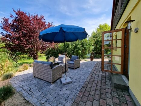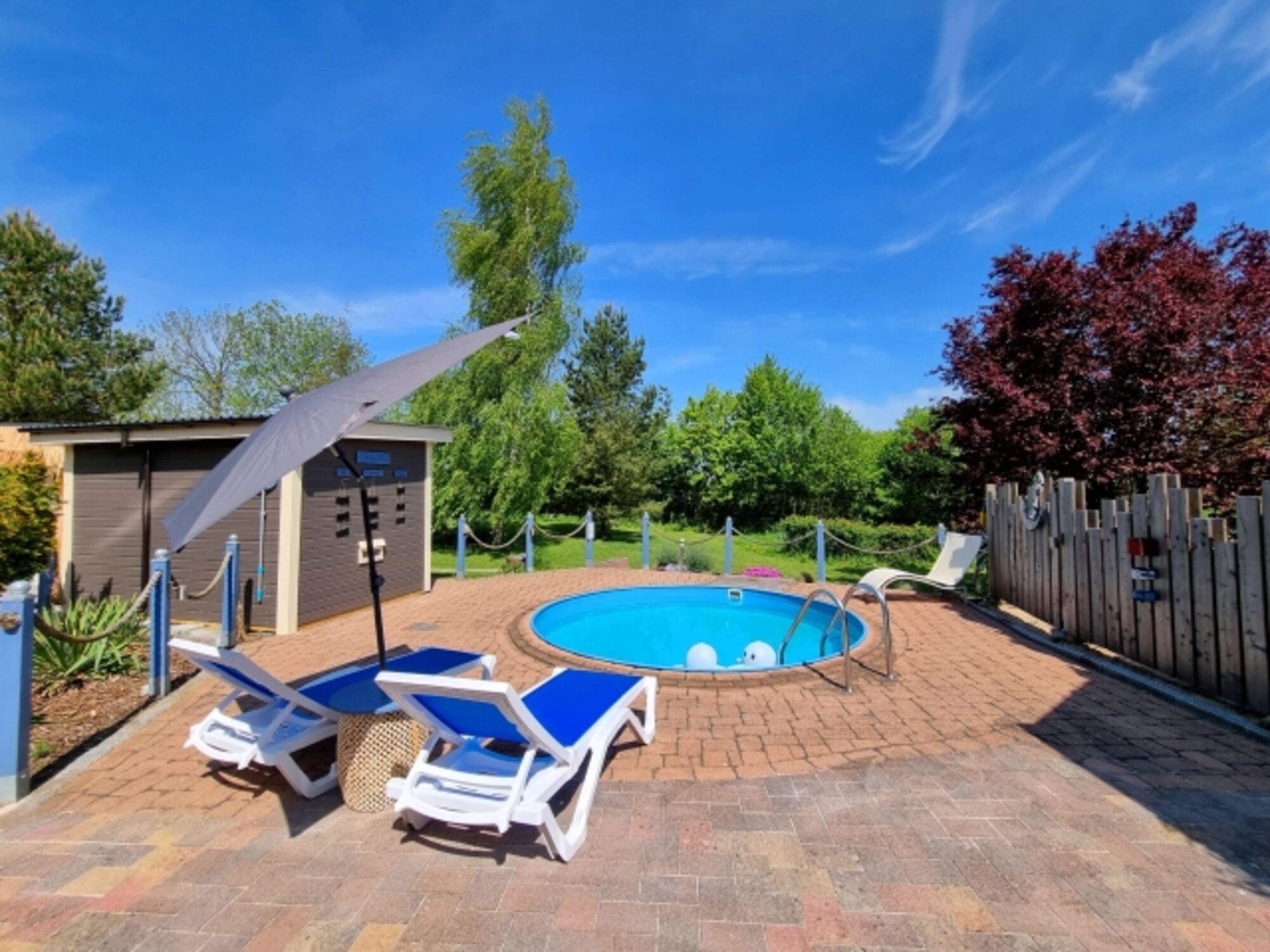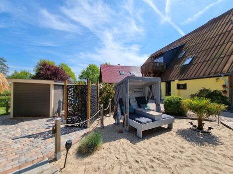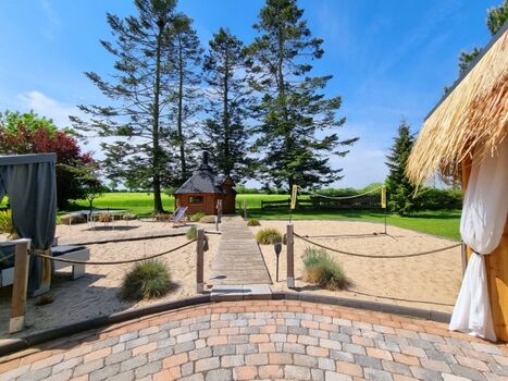 Der große Garten ist mit über 1000qm ein grünes Paradies. Für Erfrischung sorgt der Rundpool, für Wärme und Entspannung die Sauna mit zugehöriger Außendusche. Sollte es einmal regnerisch sein, oder wenn ihr es einfach nur gemütlich mögt, steht eine Grillkota als Mittelpunkt zwischen eigens angelegten Sandgärten bereit. Für Aktive Gäste gibt es einen Sandplatz mit Netz zum Volleyball und Badminton spielen, eine Tischtennisplatte und eine Outdoor-Dartscheibe. Über das gesamte Areal sind mehrere Sitzecken mit und ohne Sonnenschirme verteilt. Auch abends sorgt die Ausrichtung nach Westen für die schönsten Sonnenuntergänge über die Weiten der Felder. Dazu lässt sich stimmungsvolle Beleuchtung einschalten und die Ruhe genießen.