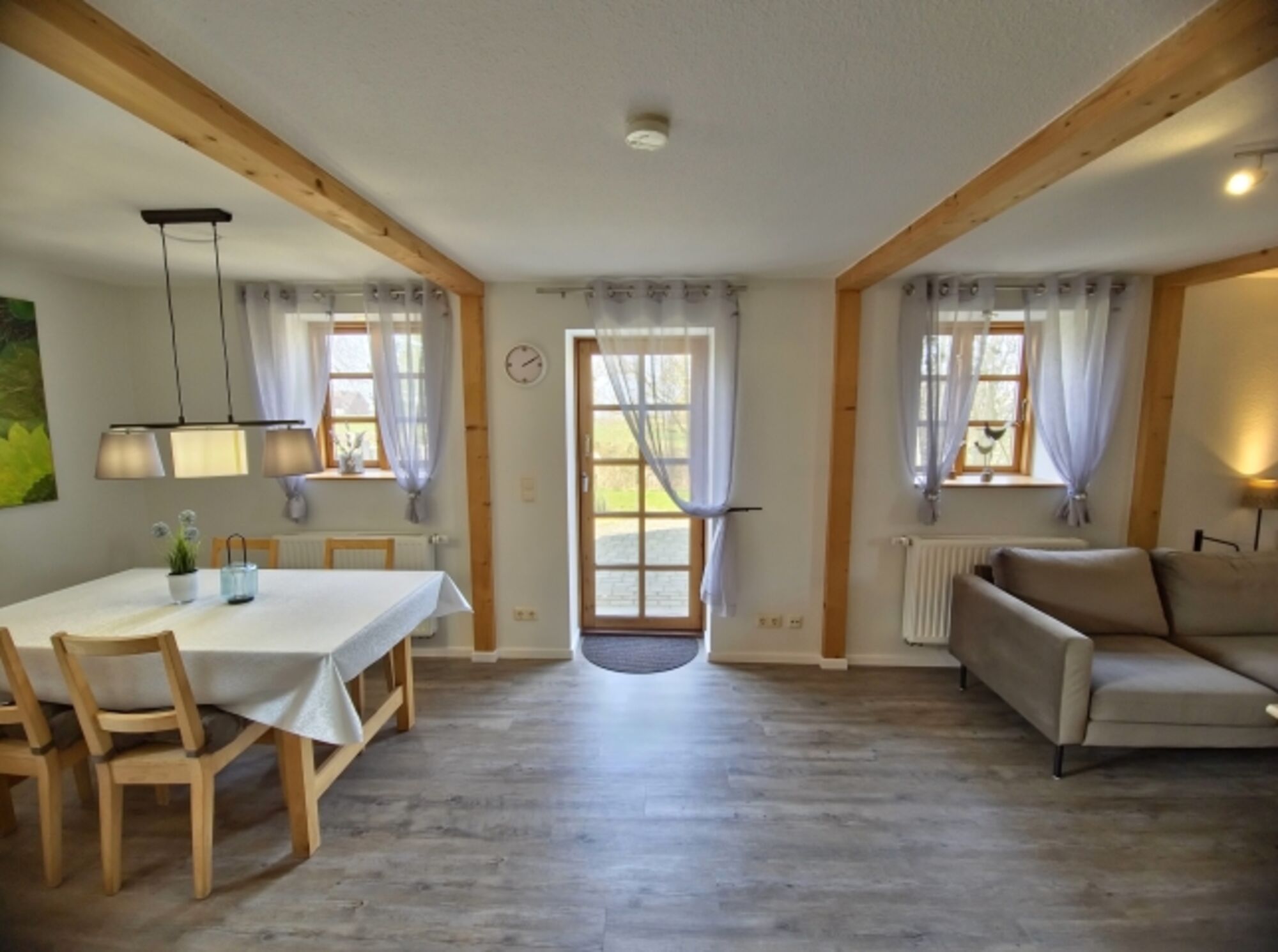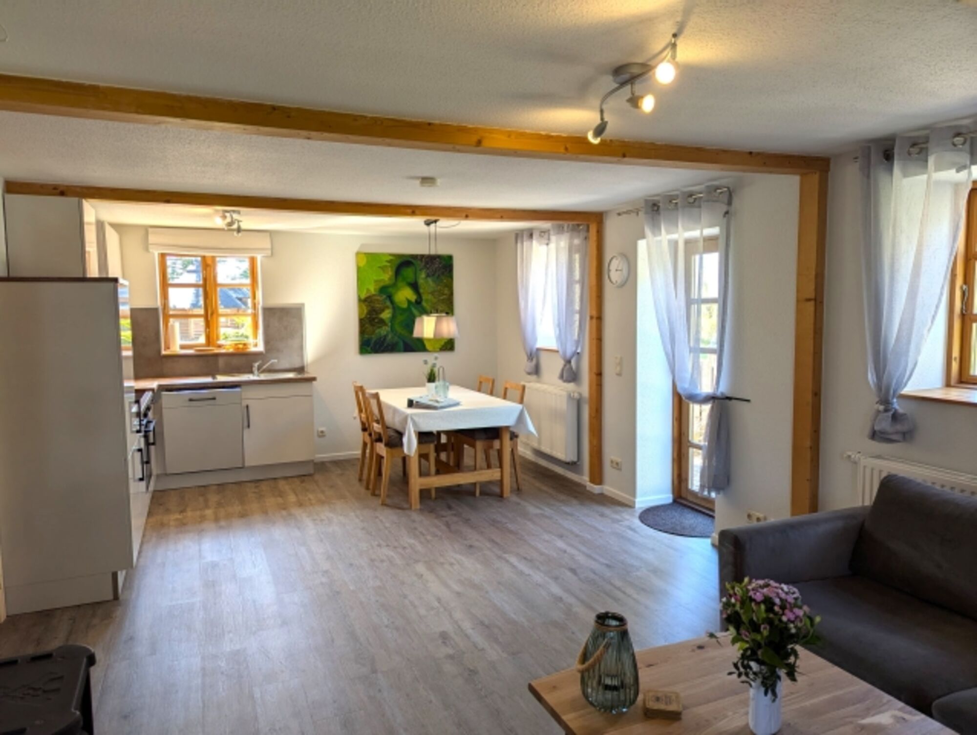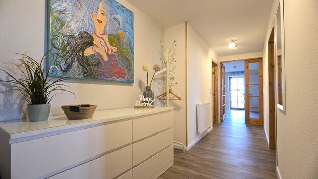 Euch begrüßt eine 3-Zimmer-Wohnung im Erdgeschoss, mit 2 Schlafzimmern, davon ein Schlafzimmer mit Doppelbett (160x200cm) und ein Schlafzimmer mit zwei Einzelbetten, ein großer Wohn-Essbereich mit offener Küche und Ausgang zur eigenen Terrasse mit Holzkohlegrill, sowie ein überaus großzügiges Duschbad mit Fenster.