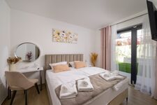 Klimaanlage im Schlafzimmer. Balkon mit gemütlicher Sitzgruppe. Doppelbett 1,80 x 2,00m, Kommode, Spiegel, Leselampe am Bett