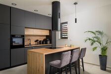 Induktionsherd, Gefrierschrank, Geschirrhandtücher, Essplatz in der Küche
