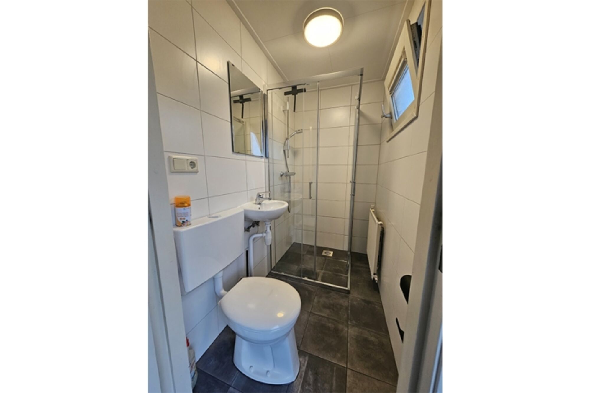 Das kürzlich renovierte Badezimmer (2024) verfügt über eine Duschkabine, ein Waschbecken und eine Toilette.