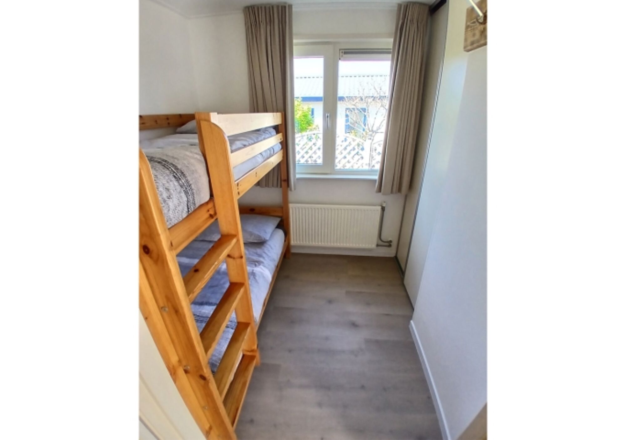 Im Inneren finden Sie zwei separate Schlafzimmer. Ein Schlafzimmer ist mit einem Etagenbett und das andere mit einem Doppelbett ausgestattet.