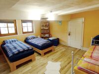In der oberen Etage befinden sich die zwei Schlafzimmer. Ein Zimmer ist mit einem Doppelbett und großem Kleiderschrank ausgestattet. Das zweite Schlafzimmer mit drei Einzelbetten, Kleiderschrank und transportablen Schlafsessel.