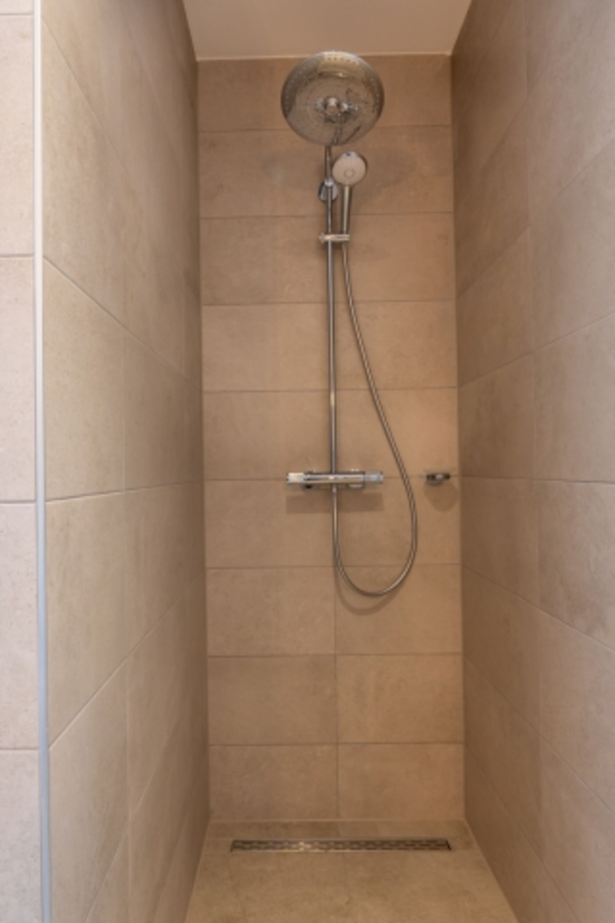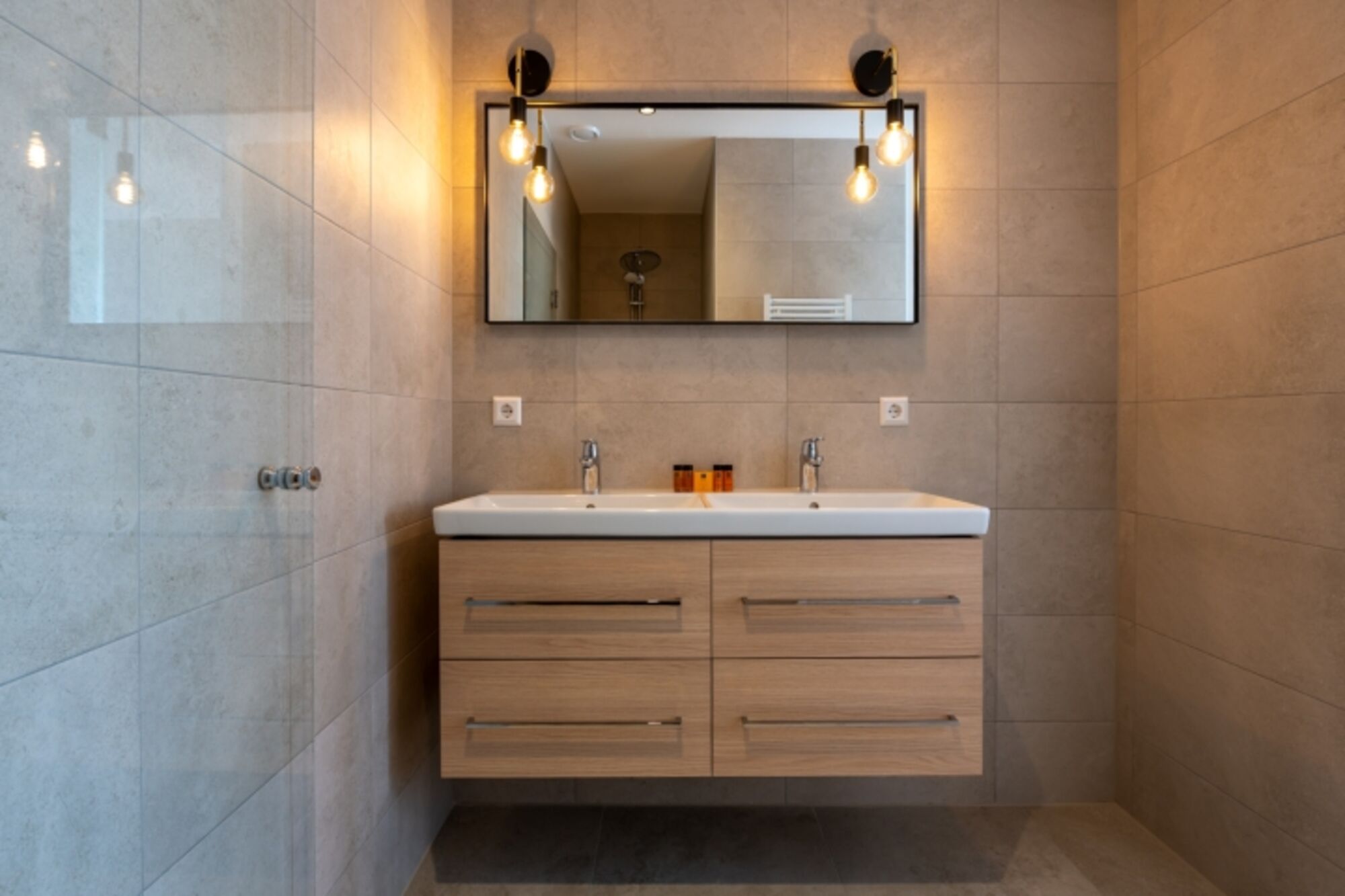 Doppelwaschbecken, Regendusche, Spiegel