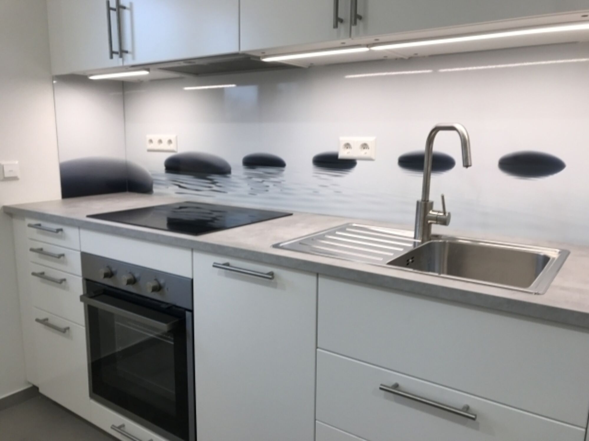 Die restlichen Wohnung besteht aus einer Küche und einem Aufenthaltsbereich mit einem 2er-Sofa. Die Küche hat einen großzügigen Essbereich und einen Fernseher. Zudem geht von der Küche eine kleine Abstellkammer ab, in welcher verschiedene Utensilien gelagert werden können.