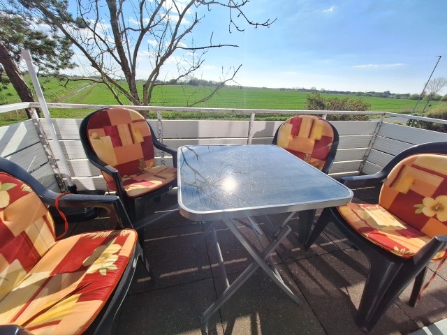 Von hier aus erreichen Sie den Balkon, welcher zum Verweilen einlädt. Hier stehen vier Stühle, ein Tisch sowie ein Sonnenschirm zur Verfügung.