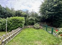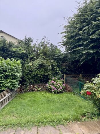 Flur, Duschbad mit Waschmaschine , Küche mit Einbauküche (ohne Backofen), Wohnzimmer mit Essbereich, Terrasse und Garten.