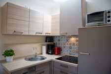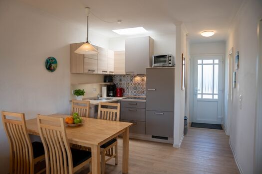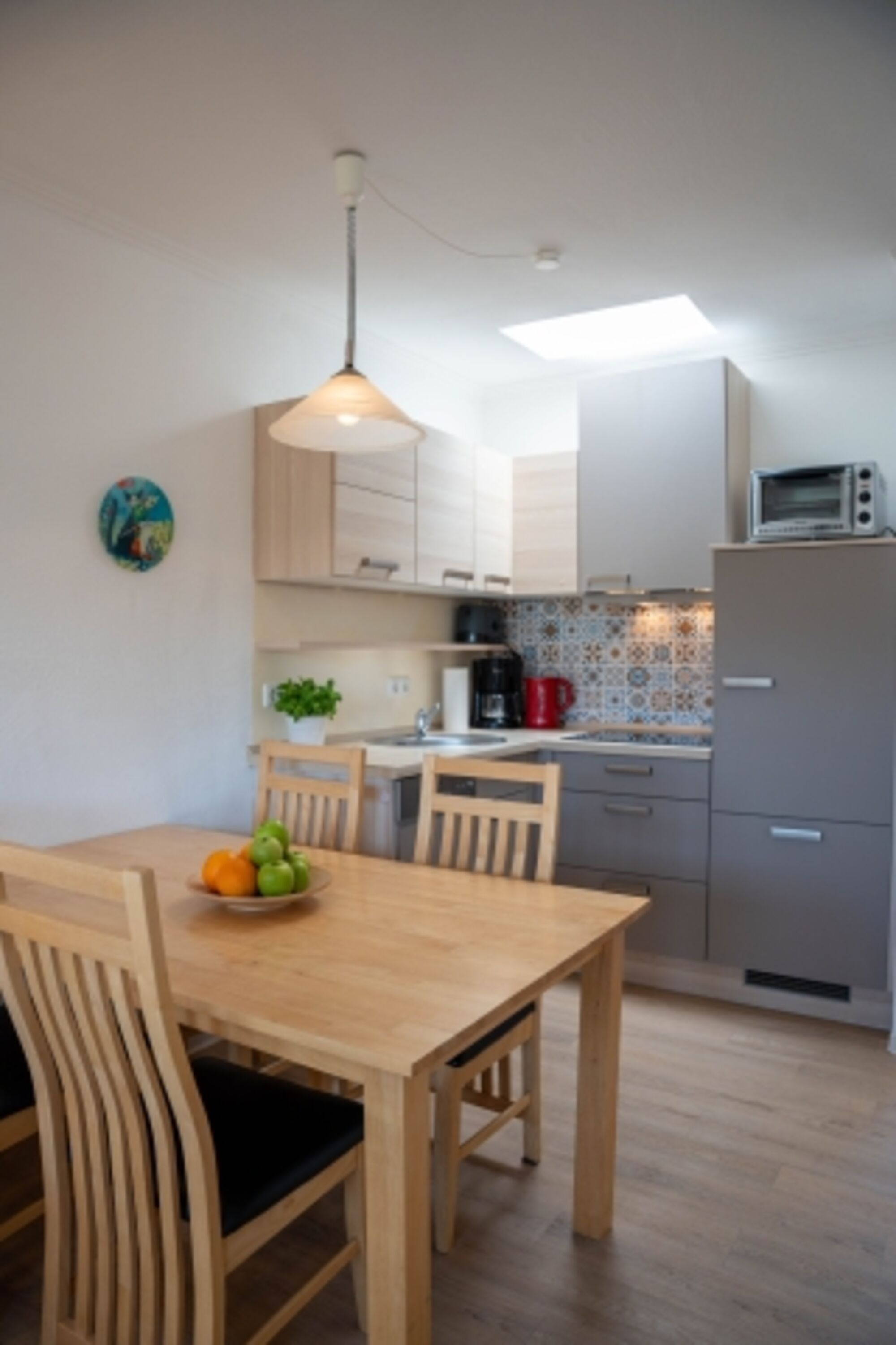 Cerankochfeld, Dunstabzugshaube, Kühlschrank mit Gefrierfach, Essplatz in der Küche
