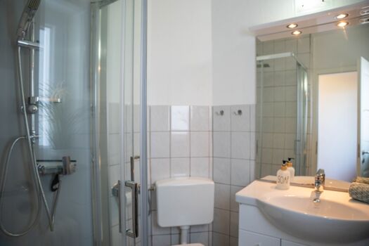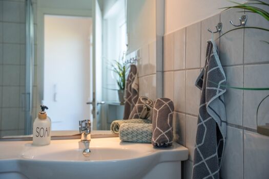 Waschbecken, Regendusche, Spiegel, Fenster im Bad