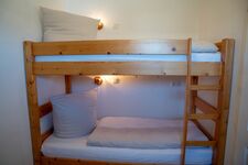Der Bungalow verfügt über ein Schlafzimmer mit einem Doppelbett (180 x 190 cm) sowie einen separaten Schlafraum mit einem Etagenbett (90 x 190 cm). Die offene Küchenzeile ist mit einem Geschirrspüler ausgestattet. Im Wohnbereich können Sie auf der Couch entspannen.Die Einrichtung ist funktional, und es gibt eine Sitzecke für bis zu vier Personen, perfekt für gemeinsame Mahlzeiten oder entspannte Abende. Im Außenbereich gibt es eine kleine Terrasse, die ab Juli 2025 eingezäunt sein wird, sodass auch Hunde dort sicher entspannen können.