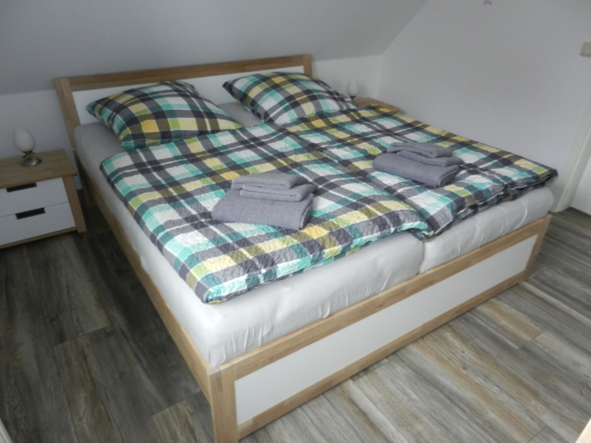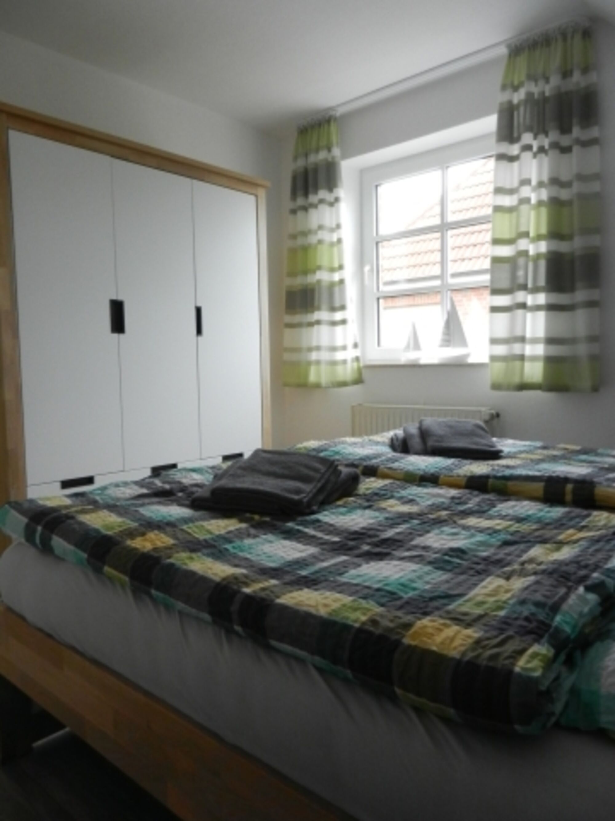 Im Schlafzimmer befinden sich ein großes Bett, welches Platz für 2 Personen bietet, ein geräumiger Kleiderschrank und je eine Nachtkonsole mit Tischleuchte.