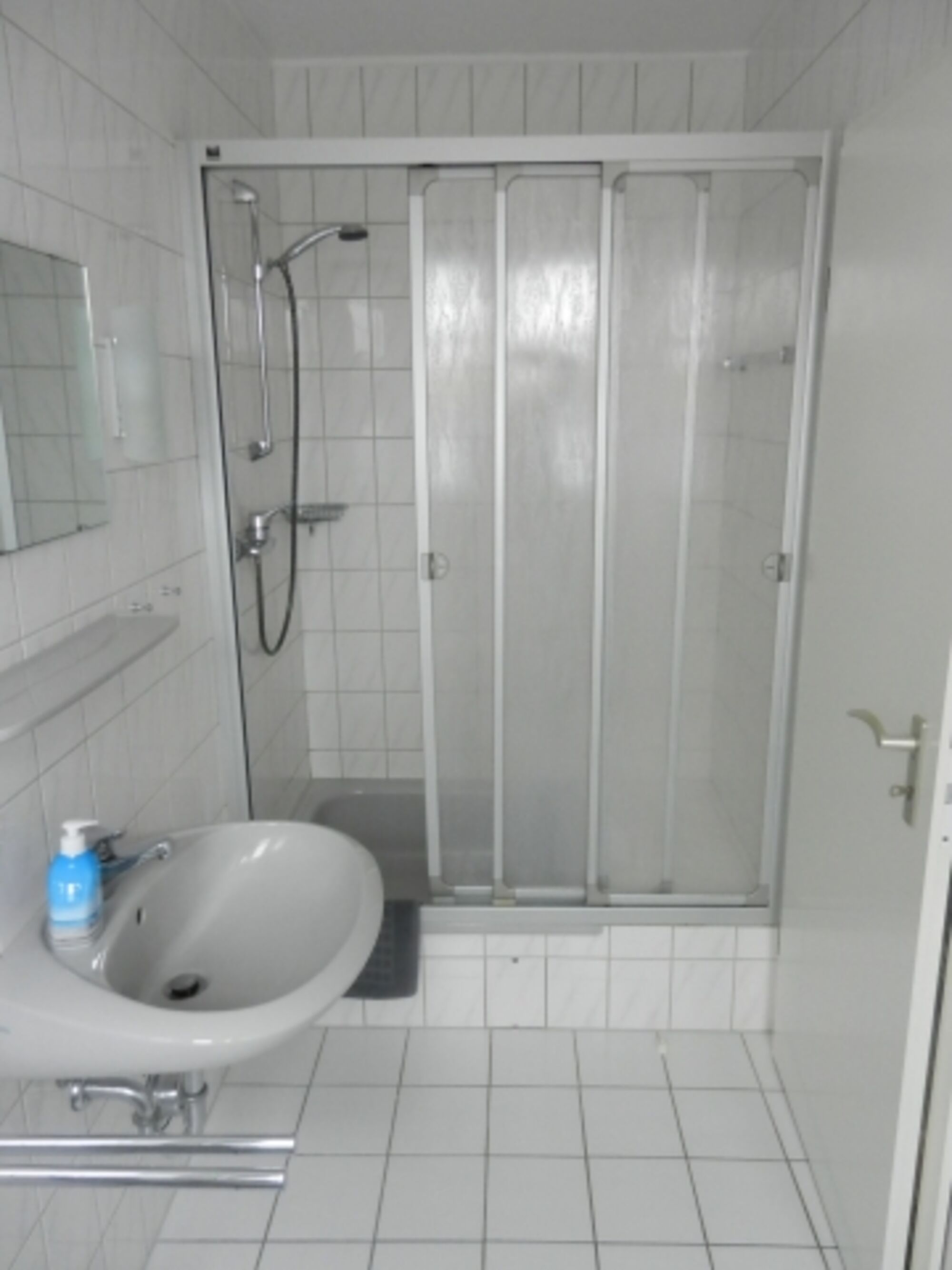 Das Badezimmer mit Tageslicht ist hell und freundlich gefliest und verfügt über eine Dusche (Duschkabine), WC, Waschtisch und Spiegel.