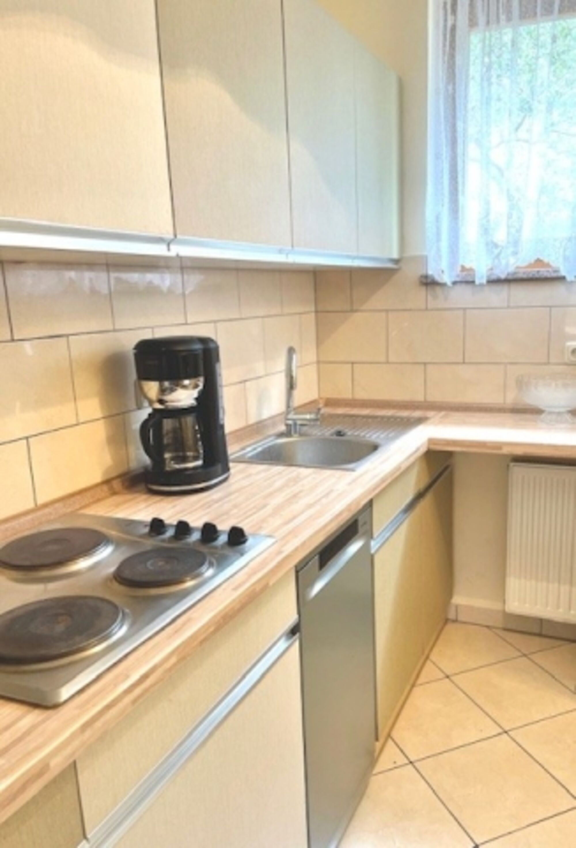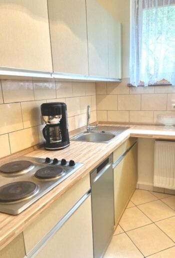 4-Platten Herd, Dunstabzugshaube, Kühlschrank mit Gefrierfach, Korkenzieher / Flaschenöffner, Geschirrhandtücher, Mülltüten, Essplatz in der Küche