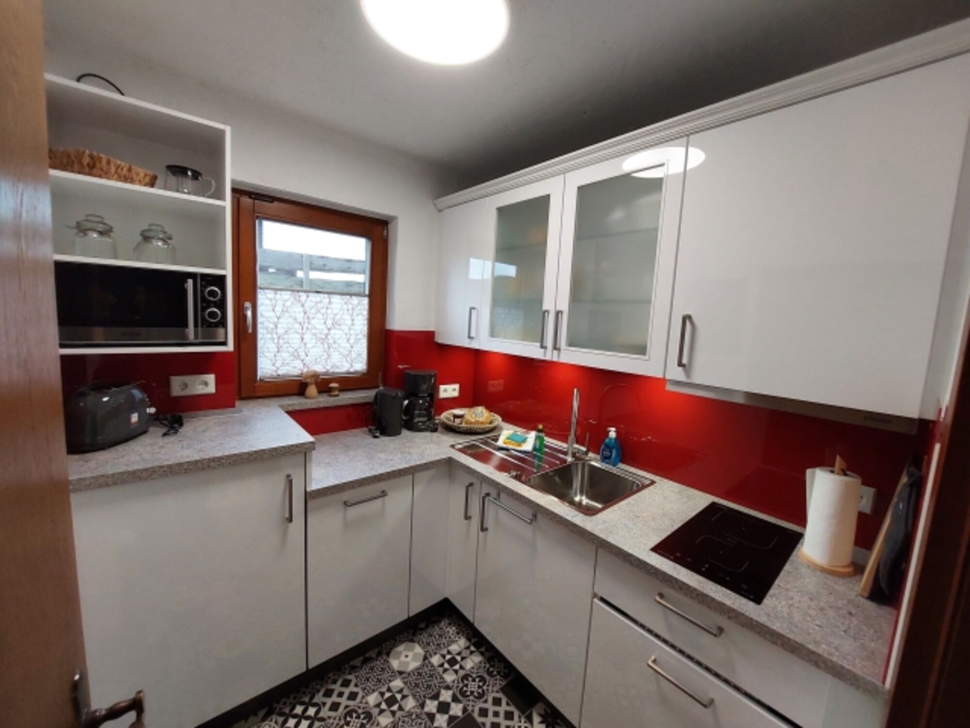 2-Platten Herd, Induktionsherd, Dunstabzugshaube, Kühlschrank mit Gefrierfach, Mixer, Korkenzieher / Flaschenöffner, Gewürze (Salz, Pfeffer, Zucker), Öl / Essig, Geschirrhandtücher, Mülltüten