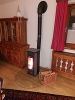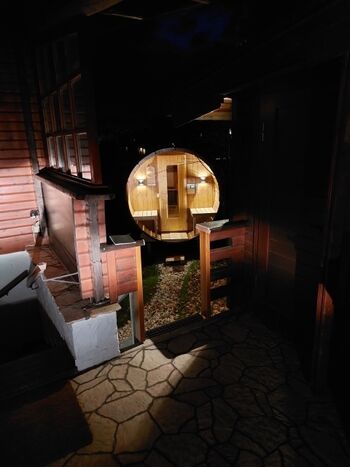 Die angekündigte Fasssauna im Garten ist in Betrieb. Ein schöner Kaminofen sorgt ab sofort für kuschelige Wärme im Biberbau.