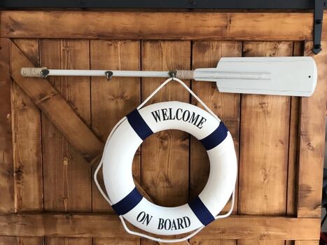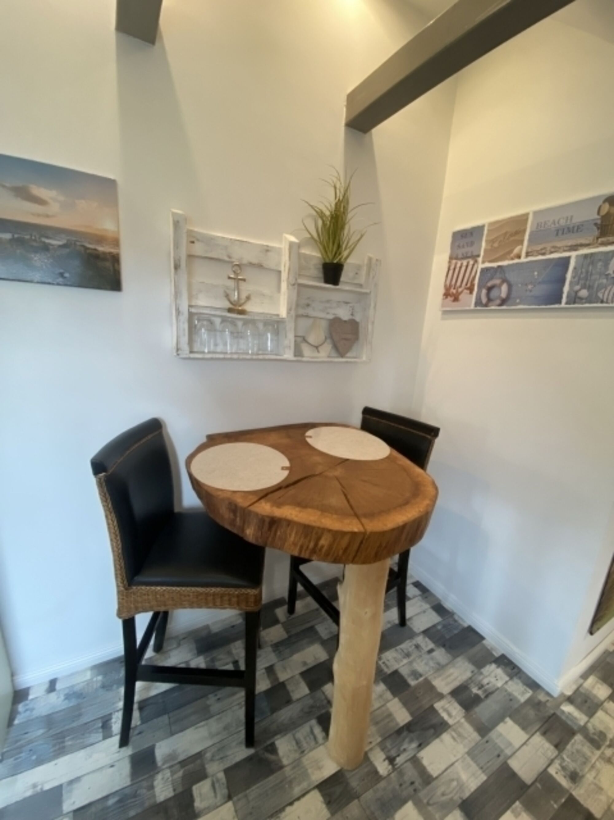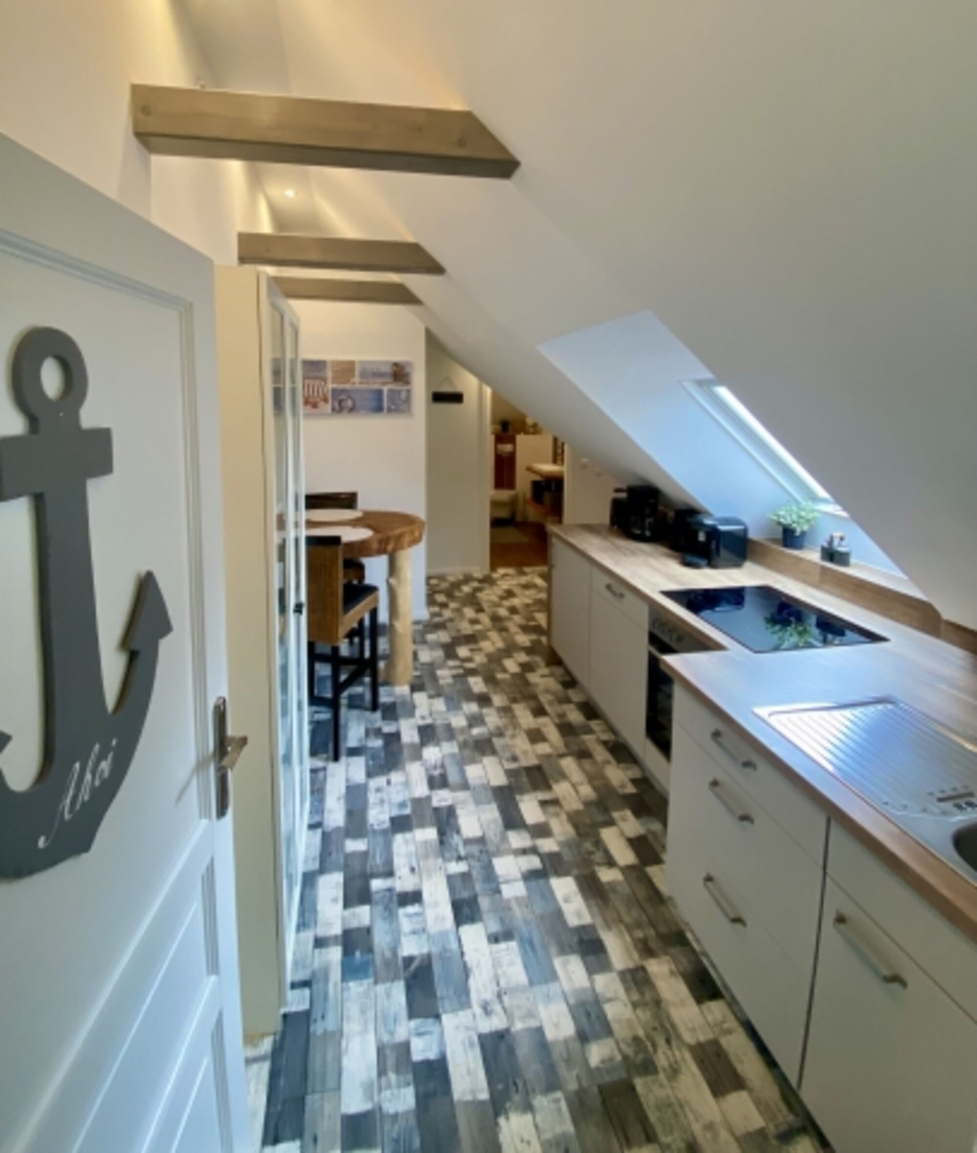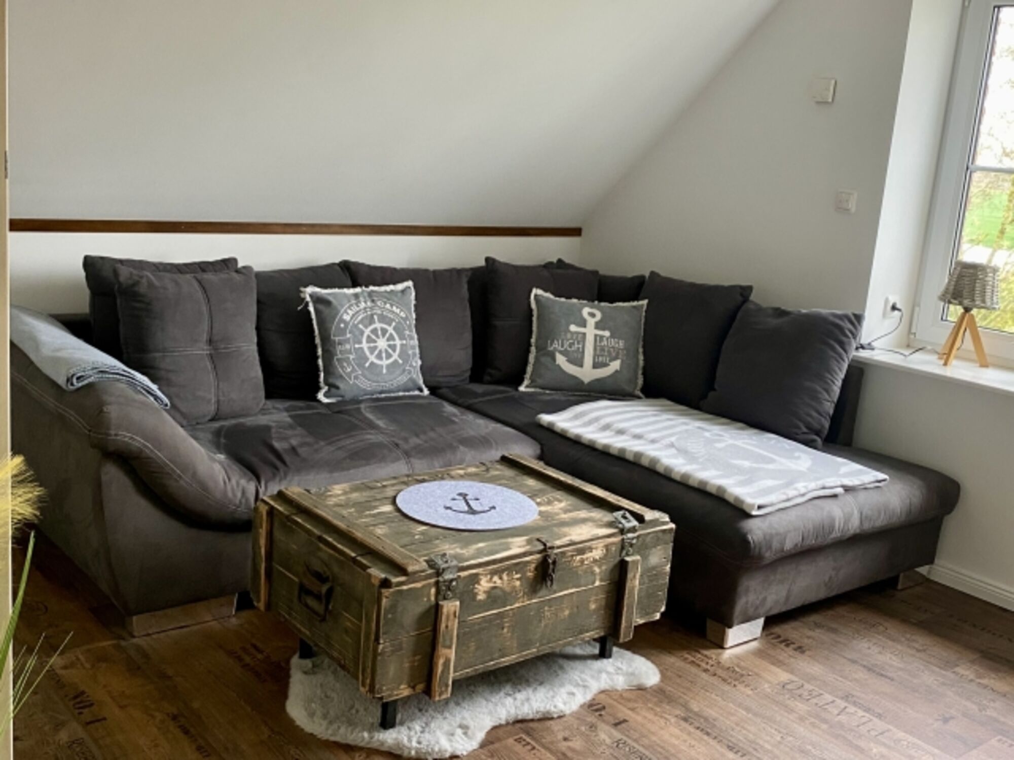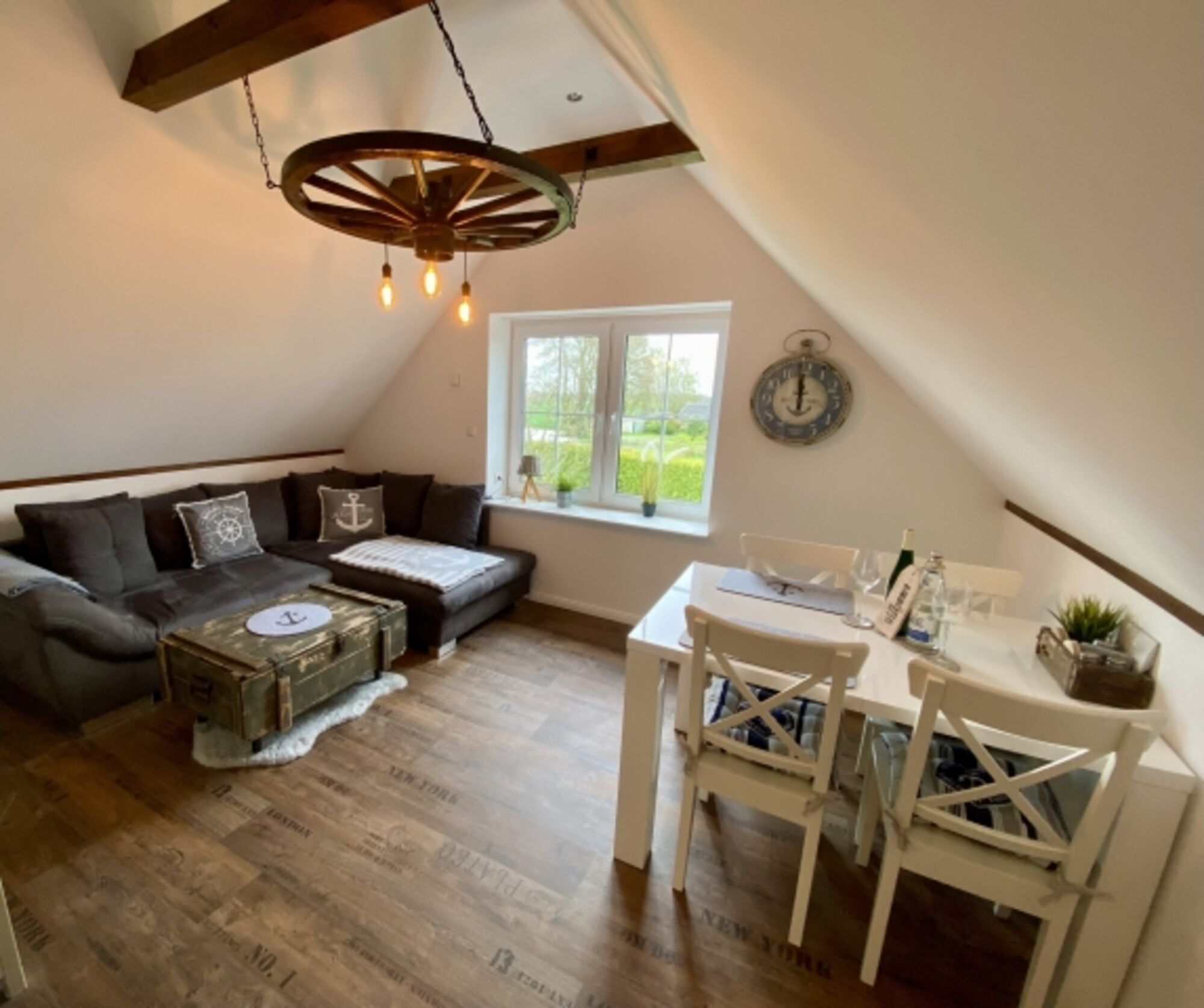 Unsere traumhaft schöne Dachgeschosswohnung AHOI lädt mit ihrem gemütlichen maritimen Einrichtungs-Stil zum Erholen ein.