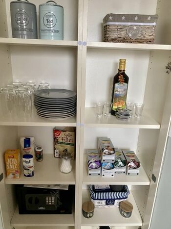 Cerankochfeld, Kühlschrank mit Gefrierfach, Tassimo-Kaffeautomat, Korkenzieher / Flaschenöffner, Gewürze (Salz, Pfeffer, Zucker), Öl / Essig, Geschirrhandtücher, Mülltüten, Essplatz in der Küche