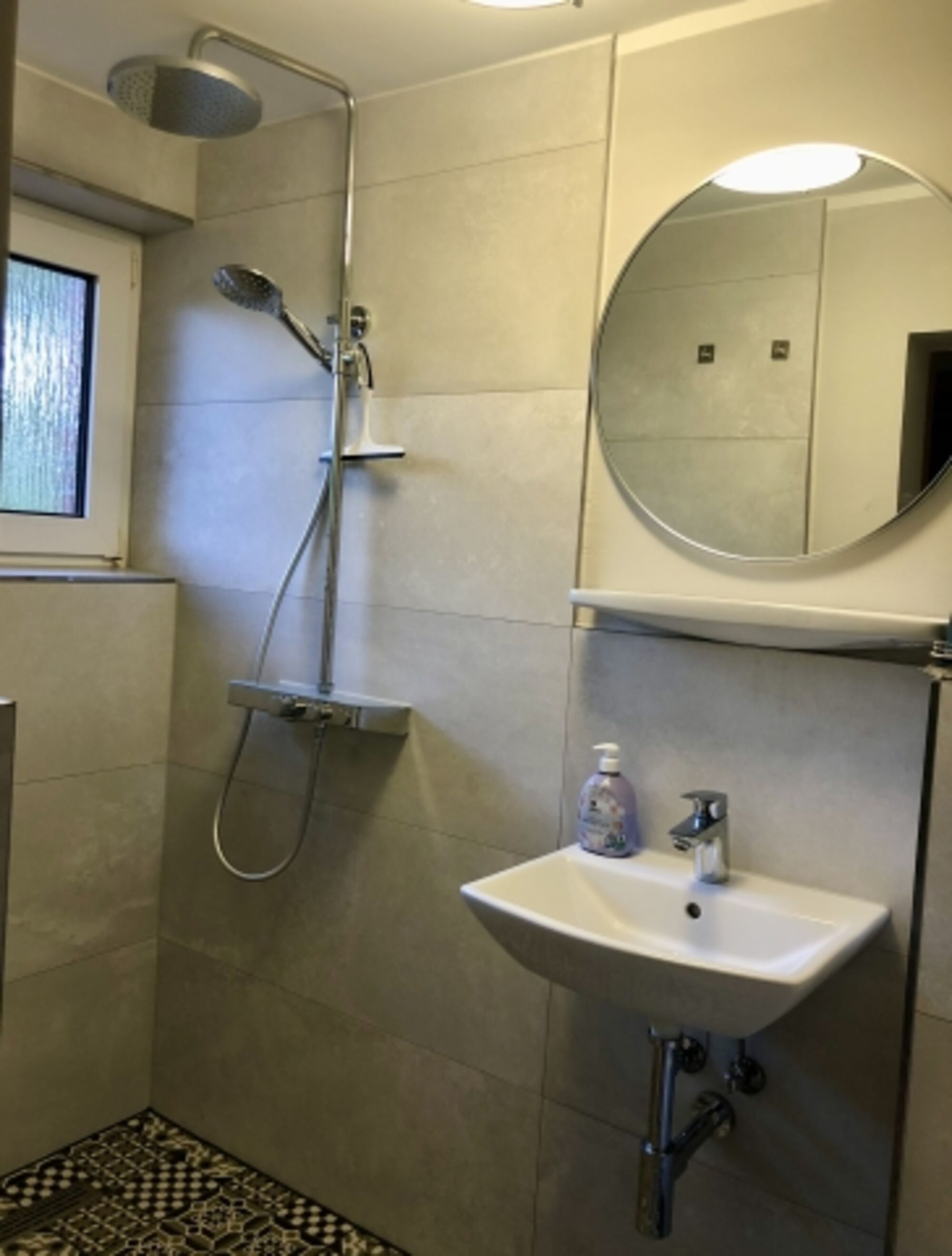 Waschbecken, Regendusche, Spiegel, Fenster im Bad