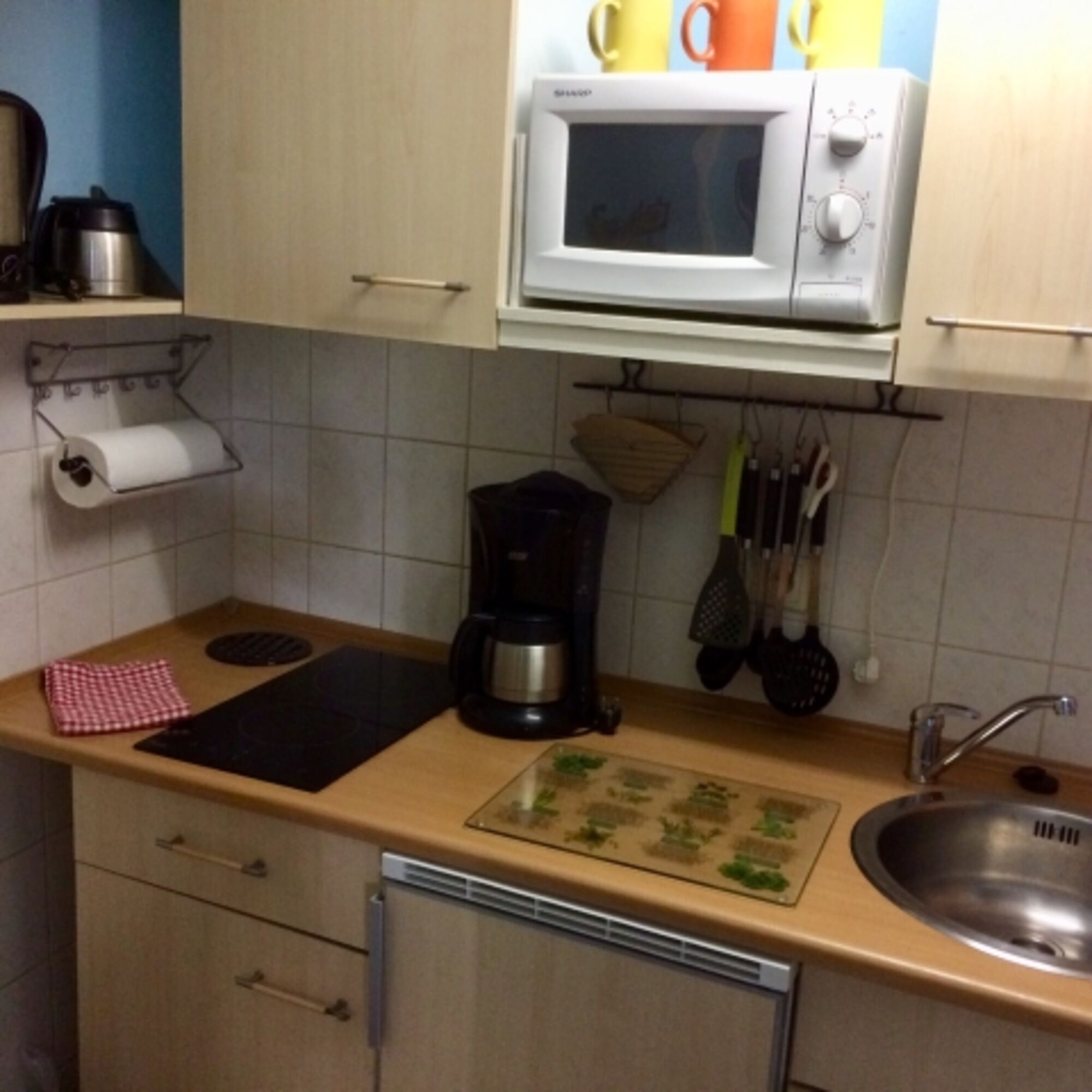2-Platten Herd, Cerankochfeld, Kühlschrank mit Gefrierfach, Korkenzieher / Flaschenöffner, Geschirrhandtücher