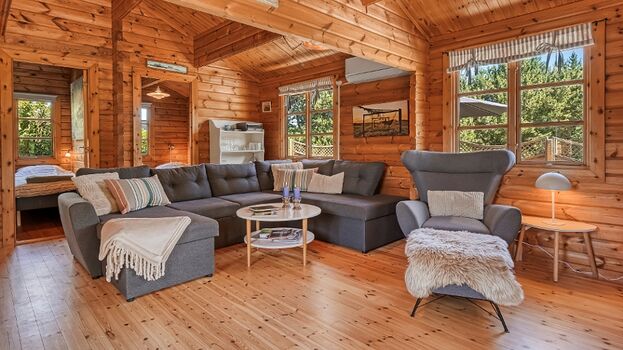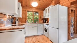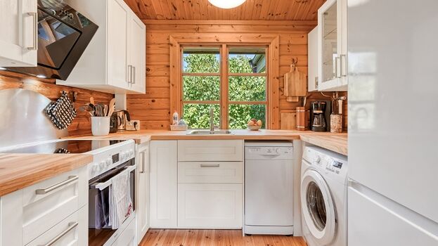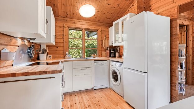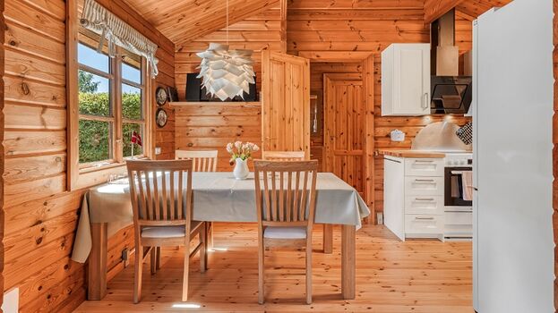 Innen überzeugt das liebevoll renovierte Ferienhaus mit einem stilvollen Mix aus skandinavischer Gemütlichkeit und moderner Ausstattung. Der offene Wohn- und Essbereich lädt zu entspannten Stunden ein – ob mit einem spannenden Buch vor dem knisternden Ofen, einem guten Film im TV oder bei geselligen Runden am großen Esstisch. In der voll ausgestatteten offenen Küche lassen sich im Handumdrehen Leckerbissen zaubern – vielleicht auch für den vierbeinigen Feinschmecker?