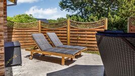 Ganz nah zum Sandstrand & doppekt eingezäunt: Terrasse und Grundstück