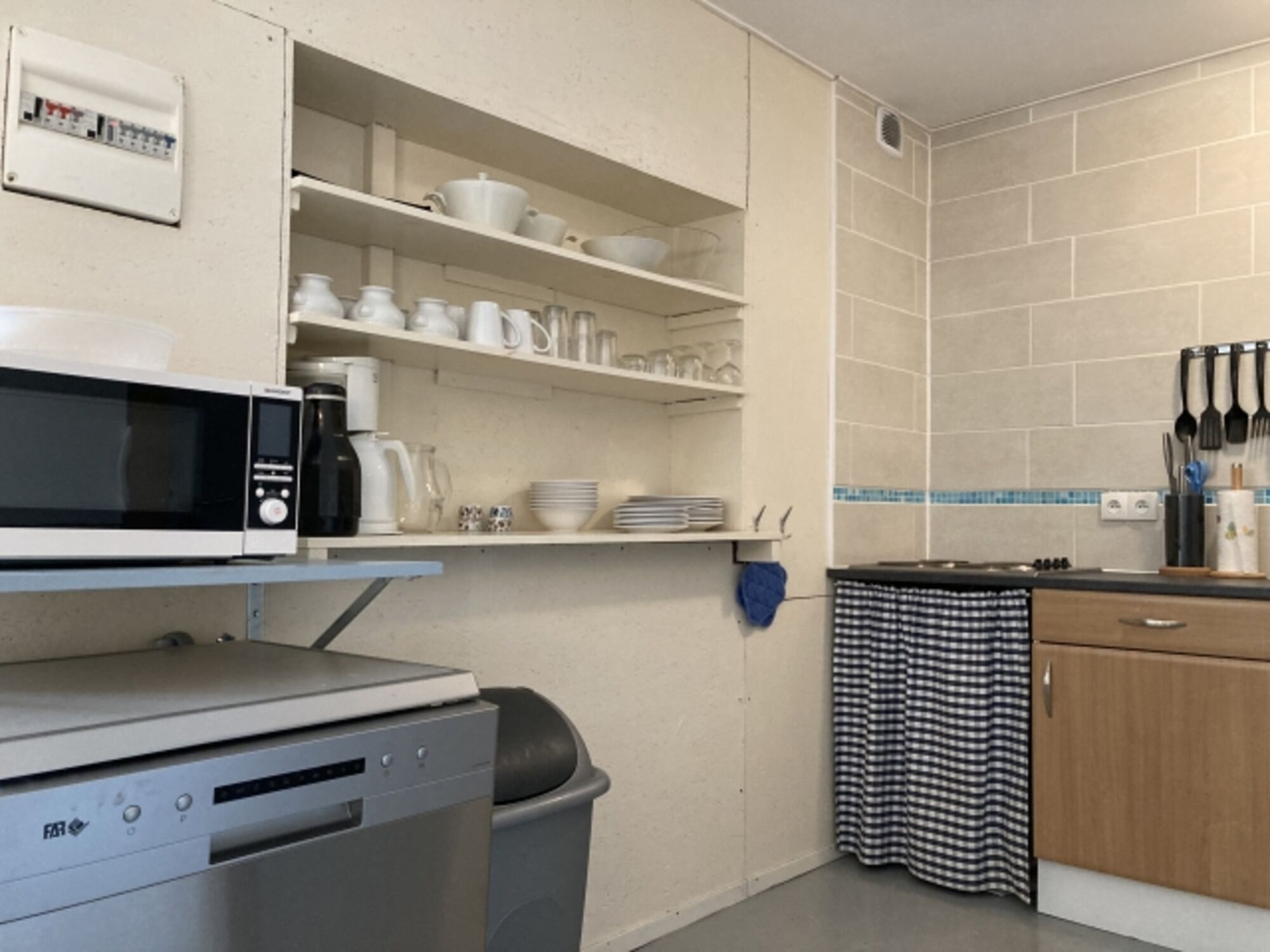 Cerankochfeld, Kühlschrank mit Gefrierfach, Korkenzieher / Flaschenöffner, Geschirrhandtücher, Mülltüten